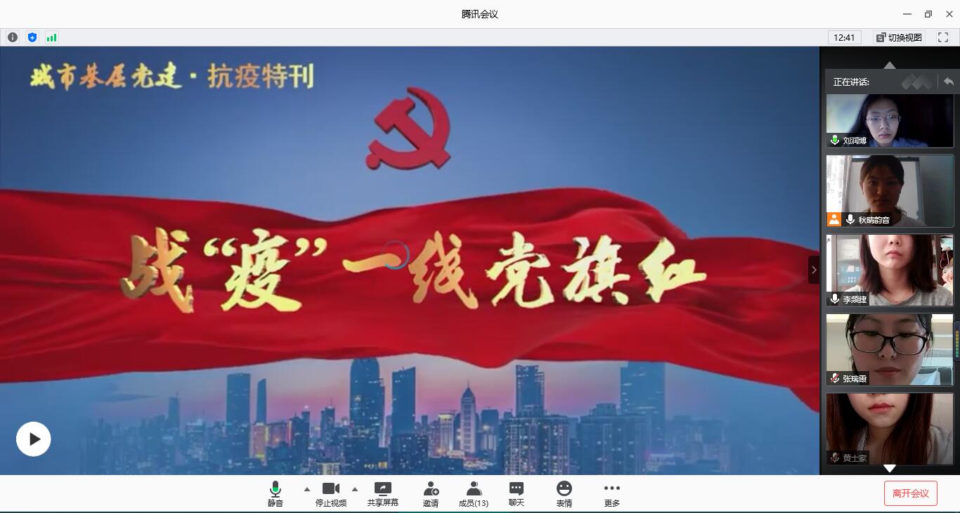 为扎实推进“牢记初新使命,争当出彩先锋”主题教育,不断升华理想信念,传承红色基因,牢记初心使命。6月28日下午,pp电子官网研究生党支部组织开展《战“疫”一线党旗红》线上观影学习交流活动,支部全体党员参与会议,会议由支部副书记李频捷主持。