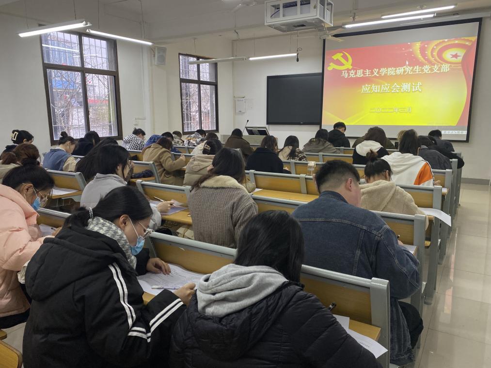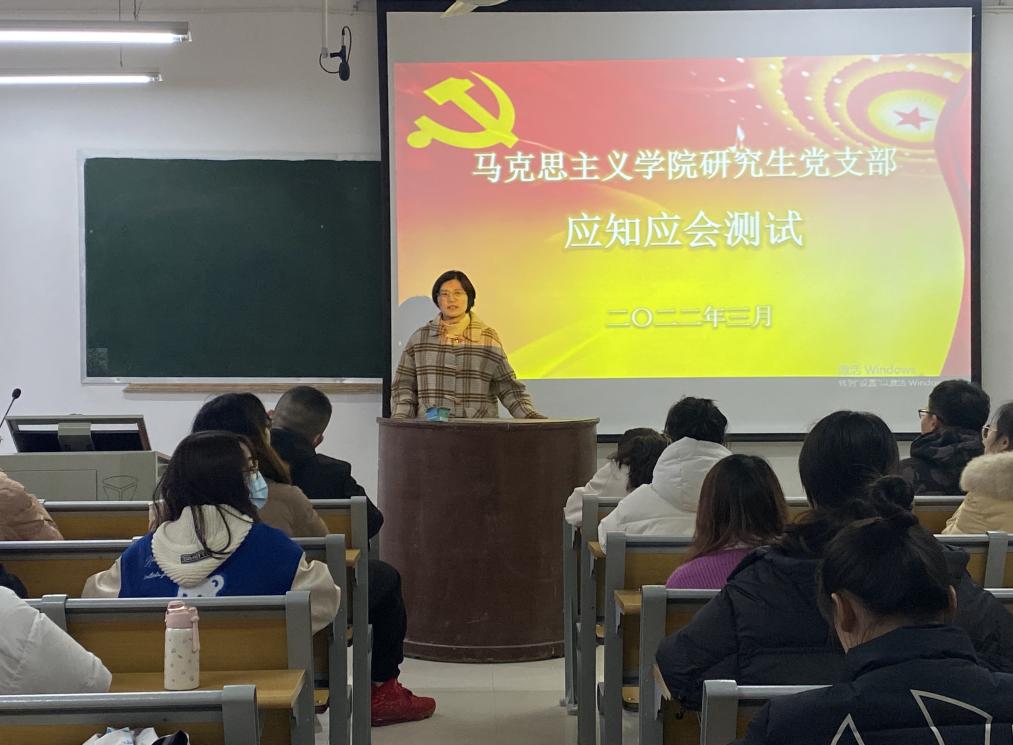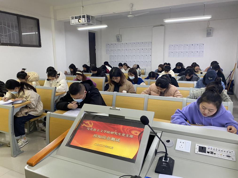 为推进“两学一做”学习教育常态化、制度化,引导基层党组织和广大学生党员、预备党员、入党积极分子进一步统一思想、凝聚共识、营造深入学习贯彻习近平新时代中国特色社会主义思想的浓厚氛围,3月17日下午,pp电子官网研究生党支部组织支部党员、预备党员、入党积极分子于教学楼5楼201、203教室开展了党员应知应会知识竞赛党日活动。活动由支部书记郑晨霞主持。