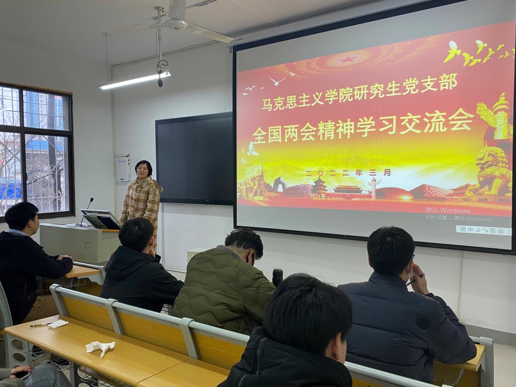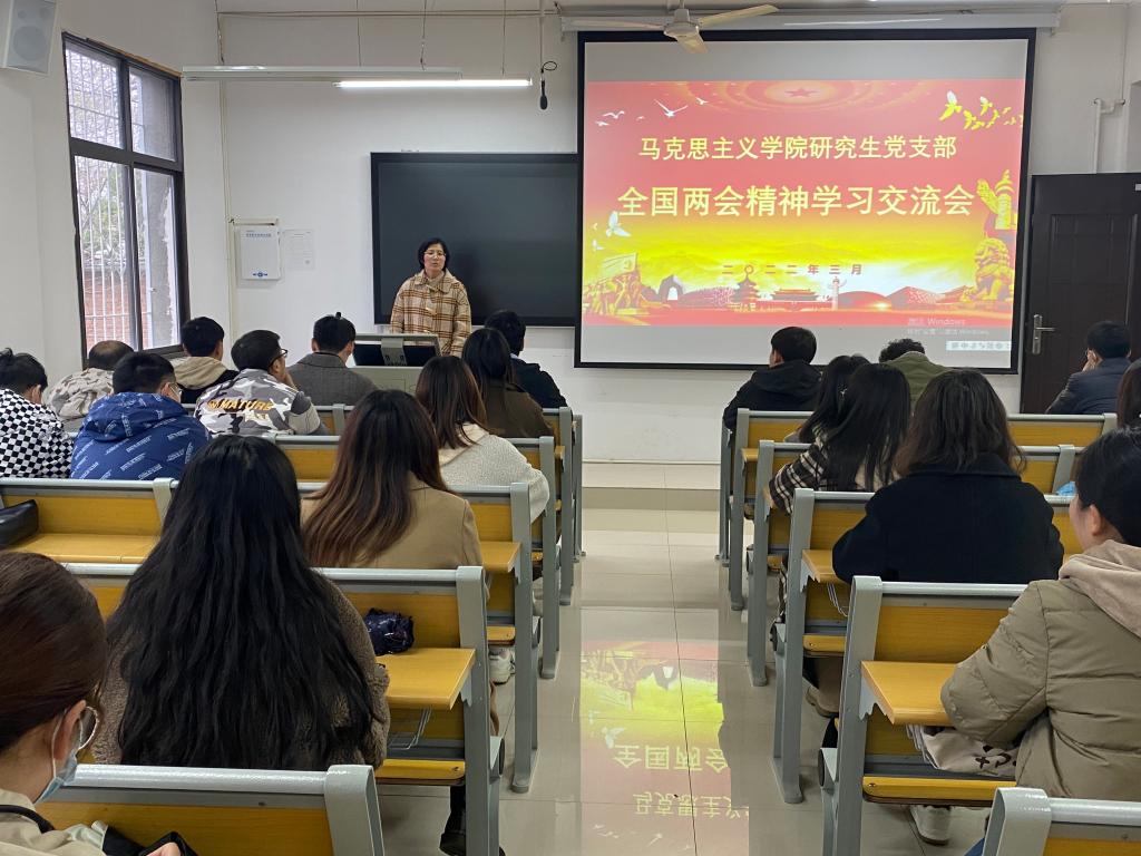 为深入学习贯彻2022年全国两会会议精神,提高pp电子官网研究生党员的政治素养和知识素养,增强把“两个确立”转化为坚决做到“两个维护”的思想自觉、政治自觉、行动自觉,3月18日,pp电子官网研究生党支部组织支部党员于教学楼五楼203教室开展全国两会精神学习交流会。会议由支部书记郑晨霞主持。
