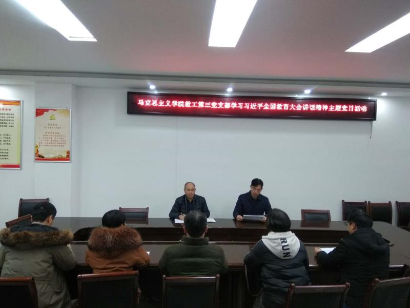 为了充分发挥教工党员的先锋模范作用,树立教工党员的良好形象,2018年12月28日下午,pp电子官方网站教工第三党支部在学院323会议室顺利召开“学习习近平全国教育大会讲话精神”主题党日活动。会议由支部书记厉有国同志主持。