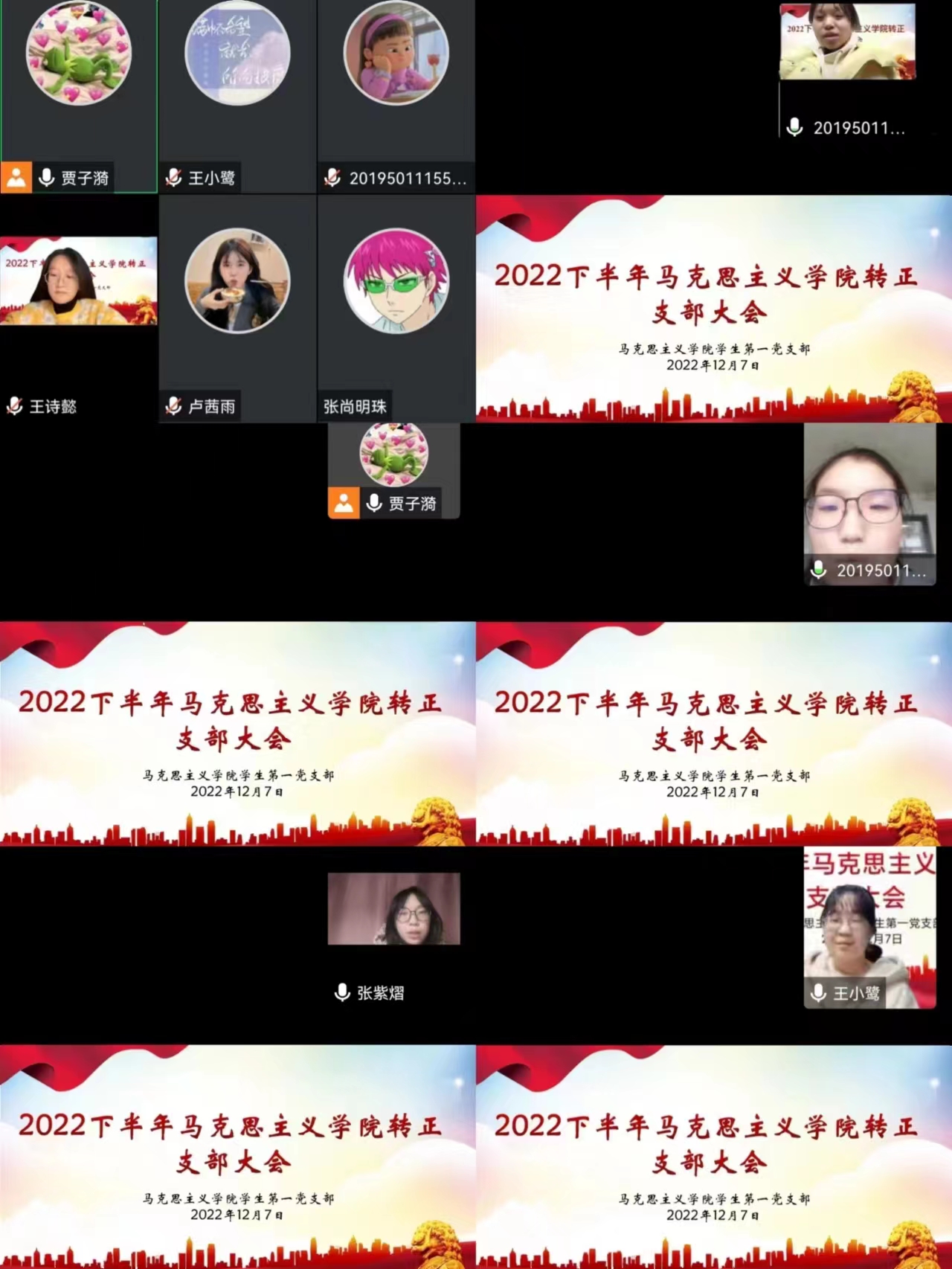 2022年12月7日下午,pp电子官方网站学生第一党支部在腾讯会议召开2022年上半年预备党员转正支部大会。pp电子官网学生第一党支部书记高小佳,学生第一党支部正式党员、预备党员共同参加本次会议。会议由卢茜雨同志主持。