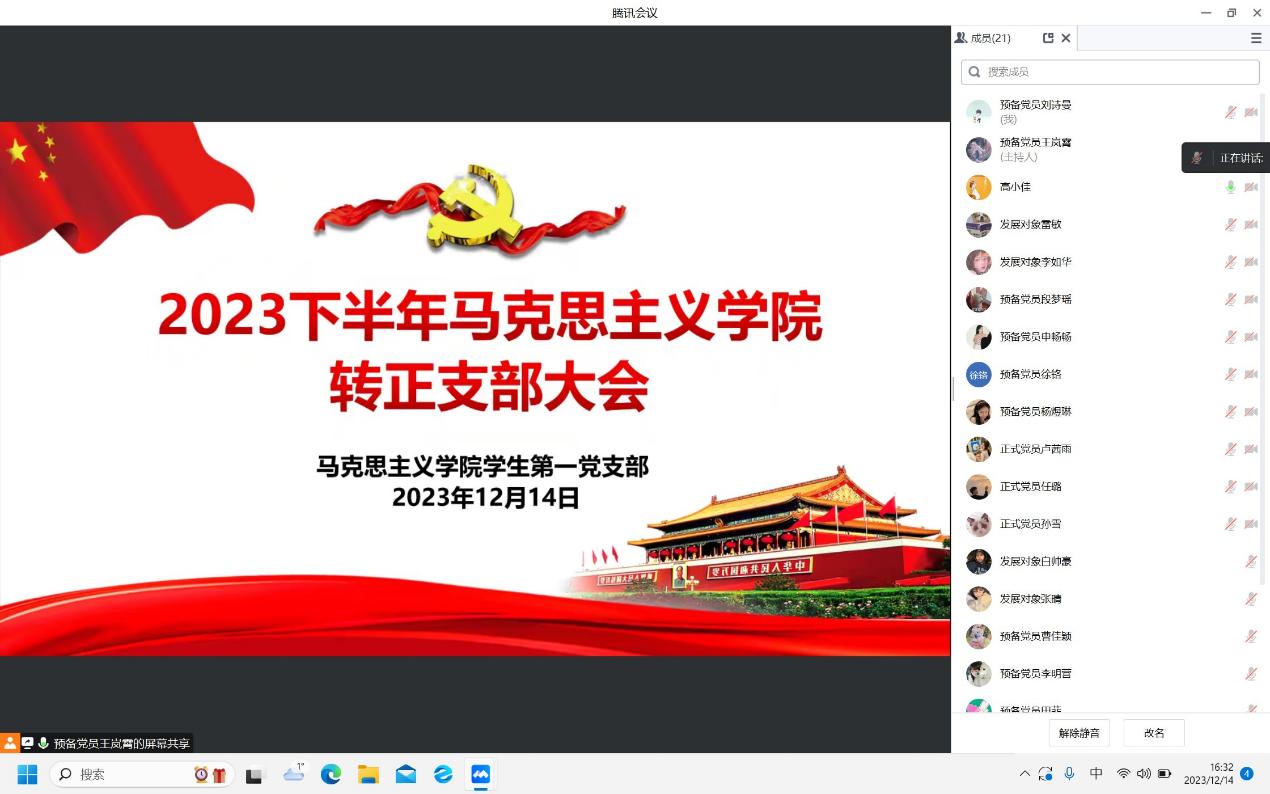 2023年12月14日下午,pp电子官方网站学生第一党支部通过腾讯会议召开2023年下半年预备党员转正支部大会。pp电子官网学生第一党支部书记高小佳,学生第一党支部全体正式党员及预备党员共同参加本次会议。会议由王岚霄同志主持。