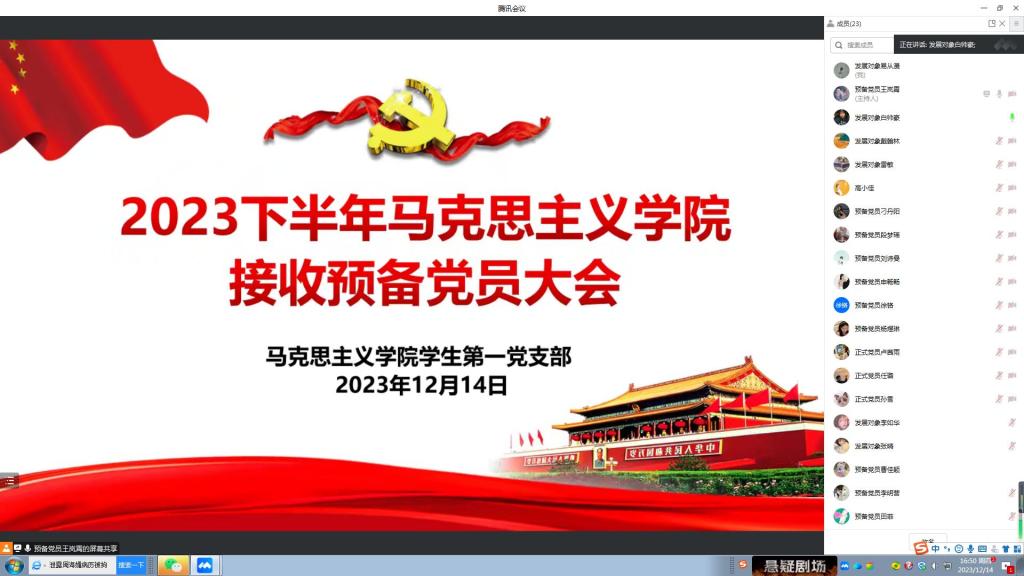 2023年12月14日下午,pp电子官方网站学生第一党支部通过腾讯会议召开了2023年下半年接收预备党员支部大会。pp电子官网学生第一党支部书记高小佳,学生第一党支部全体党员,预备党员和党员发展对象共同参加此次会议。会议由王岚霄同志主持。