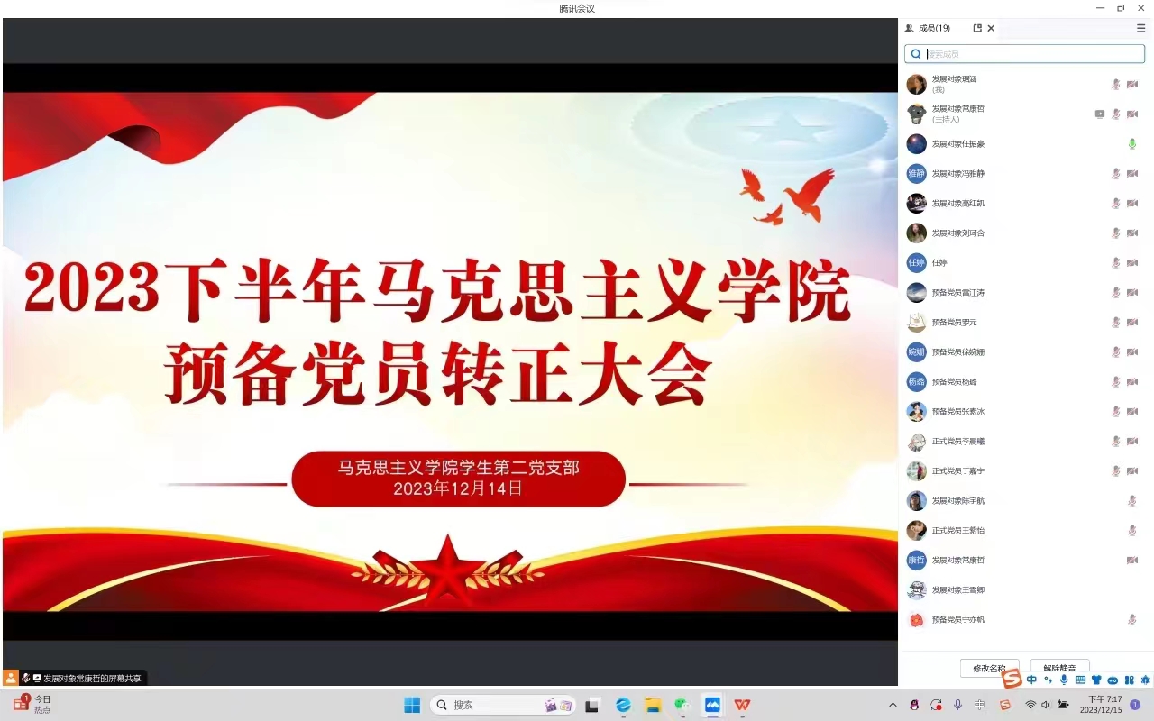 2023年12月14日下午,pp电子官方网站学生第二党支部在腾讯会议召开2023年下半年预备党员转正支部大会,pp电子官网学生第二党支部全体正式党员及预备党员共同参加本次会议。会议由任振豪同志主持。