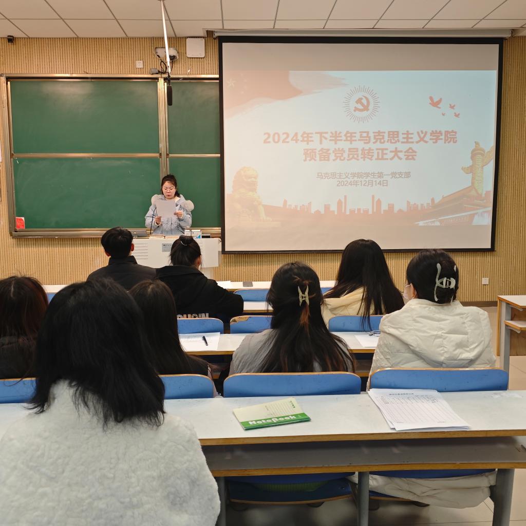 2024年12月14日下午,pp电子官方网站学生第一党支部在社科楼515教室组织召开了2024年下半年预备党员转正支部大会。pp电子官网学生第一党支部书记高小佳、学生第一党支部全体正式党员、预备党员和党员发展对象共同参加本次会议。会议由高小佳同志主持。