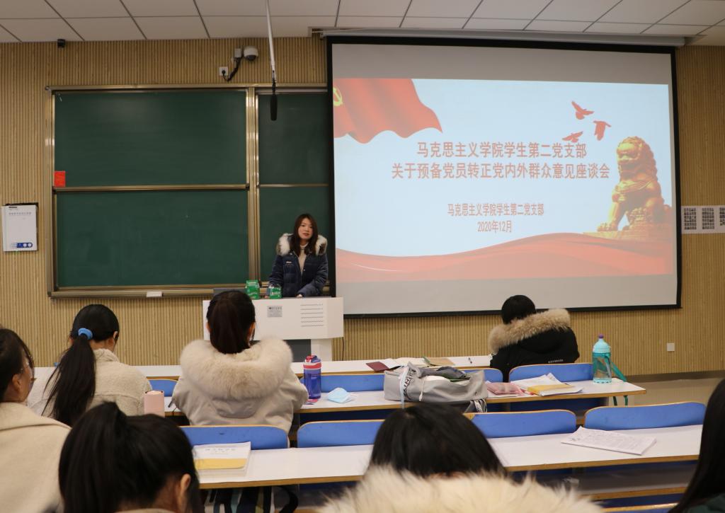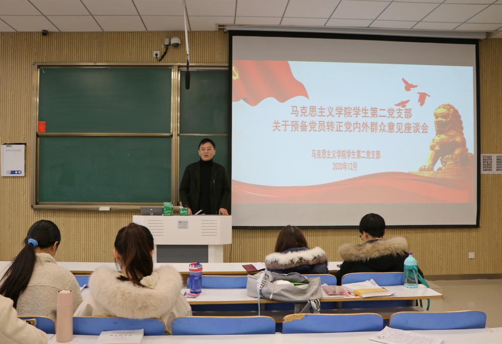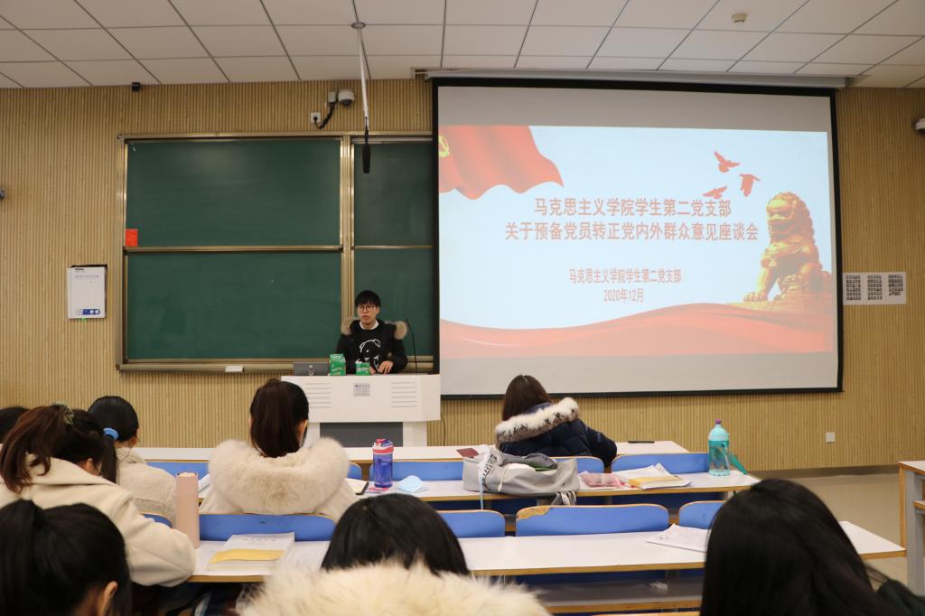 12月2日上午,pp电子官方网站学生第二党支部预备党员转正党内外群众意见座谈会在社科楼515教室顺利召开。pp电子官网学生第二党支部书记曹栋,支部正式党员陶青青、曹梦真,第二党支部预备党员以及党外群众共同参加此次会议。会议由曹栋主持。