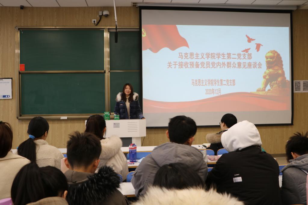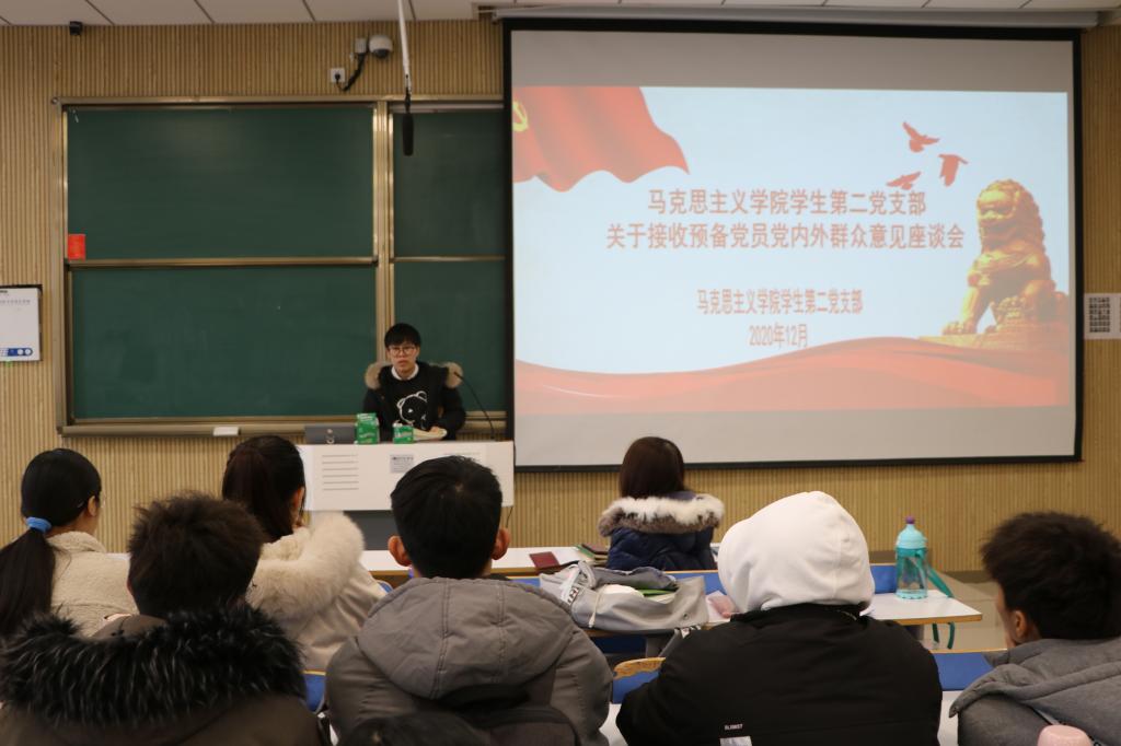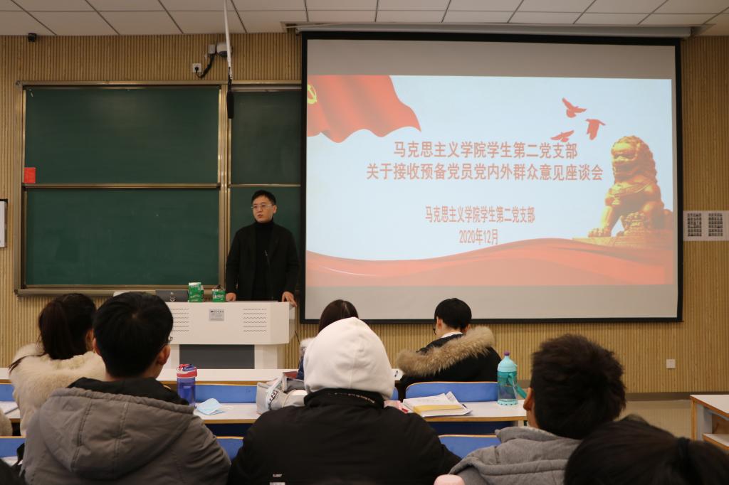 12月2日上午,pp电子官方网站学生第二党支部关于接收预备党员党内外群众意见座谈会在社科楼515教室顺利召开。pp电子官网学生第二党支部书记曹栋,支部正式党员陶青青、曹梦真,党员发展对象以及党内外群众共同参加此次座谈会。会议由曹栋主持。