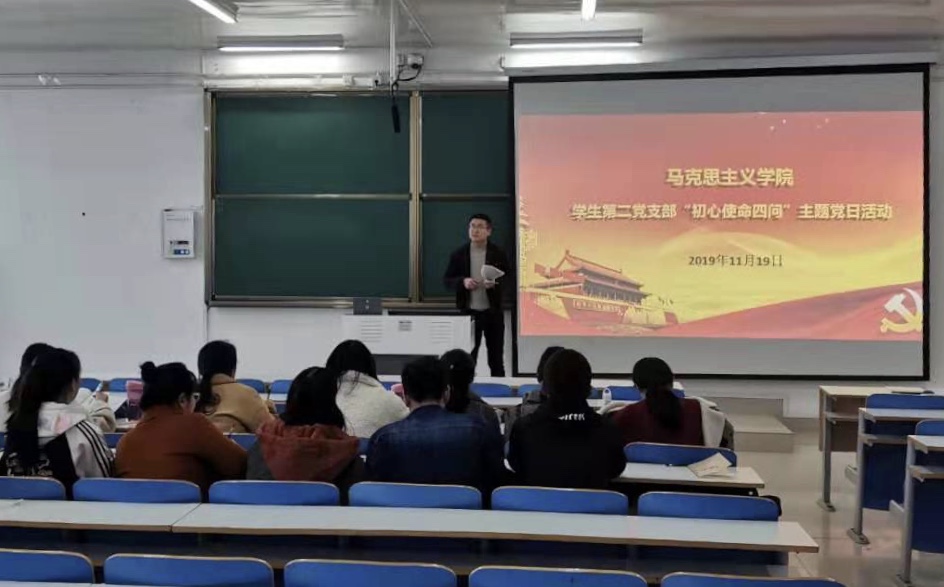 11月19日,pp电子官网学生第二党支部在社科楼514教室召开“初心使命四问”主题党日活动。pp电子官网学生第二党支部组织委员杨胜利、预备党员以及党员发展对象参加本活动。活动由杨胜利主持。