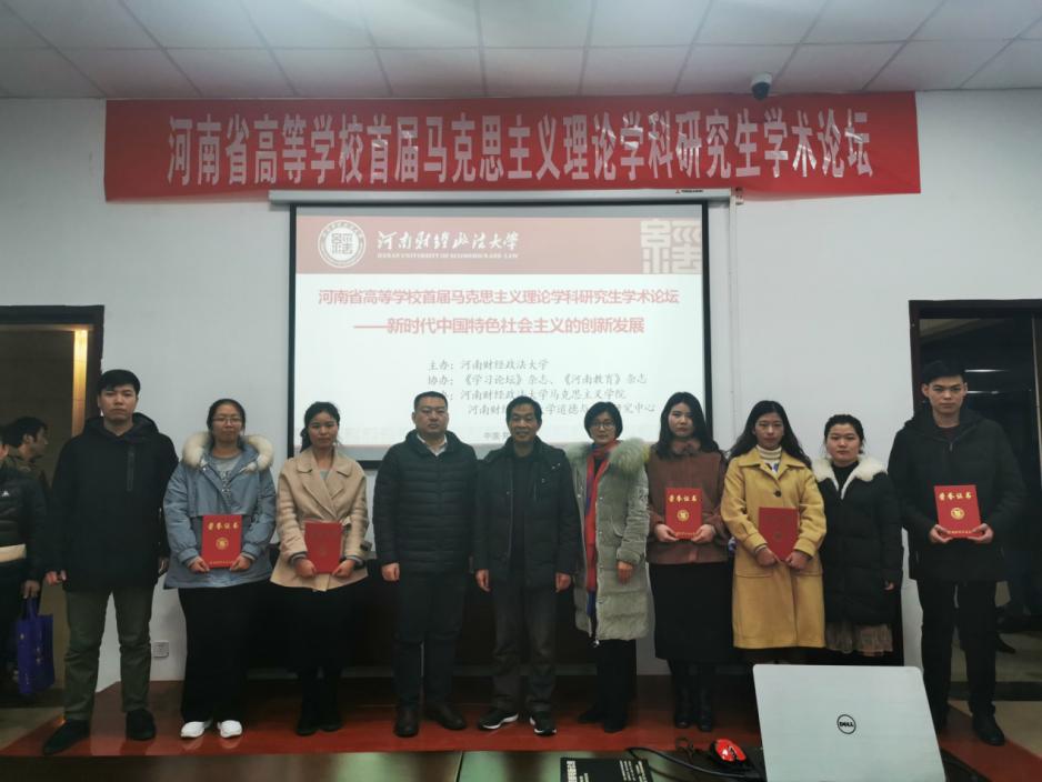 12月28日,“河南省高等学校首届马克思主义理论学科研究生学术论坛——新时代中国特色社会主义的创新发展”学术研讨会在河南财经政法大学举行,pp电子官网有7名研究生提交了学术论文并受邀参加研讨会,其中有两位同学在会上作交流发言。经会议组委会评审,pp电子官网2018级研究生张英荣获一等奖,2019级研究生詹彦彦荣获二等奖,2019级刘润博等3位学生荣获三等奖。