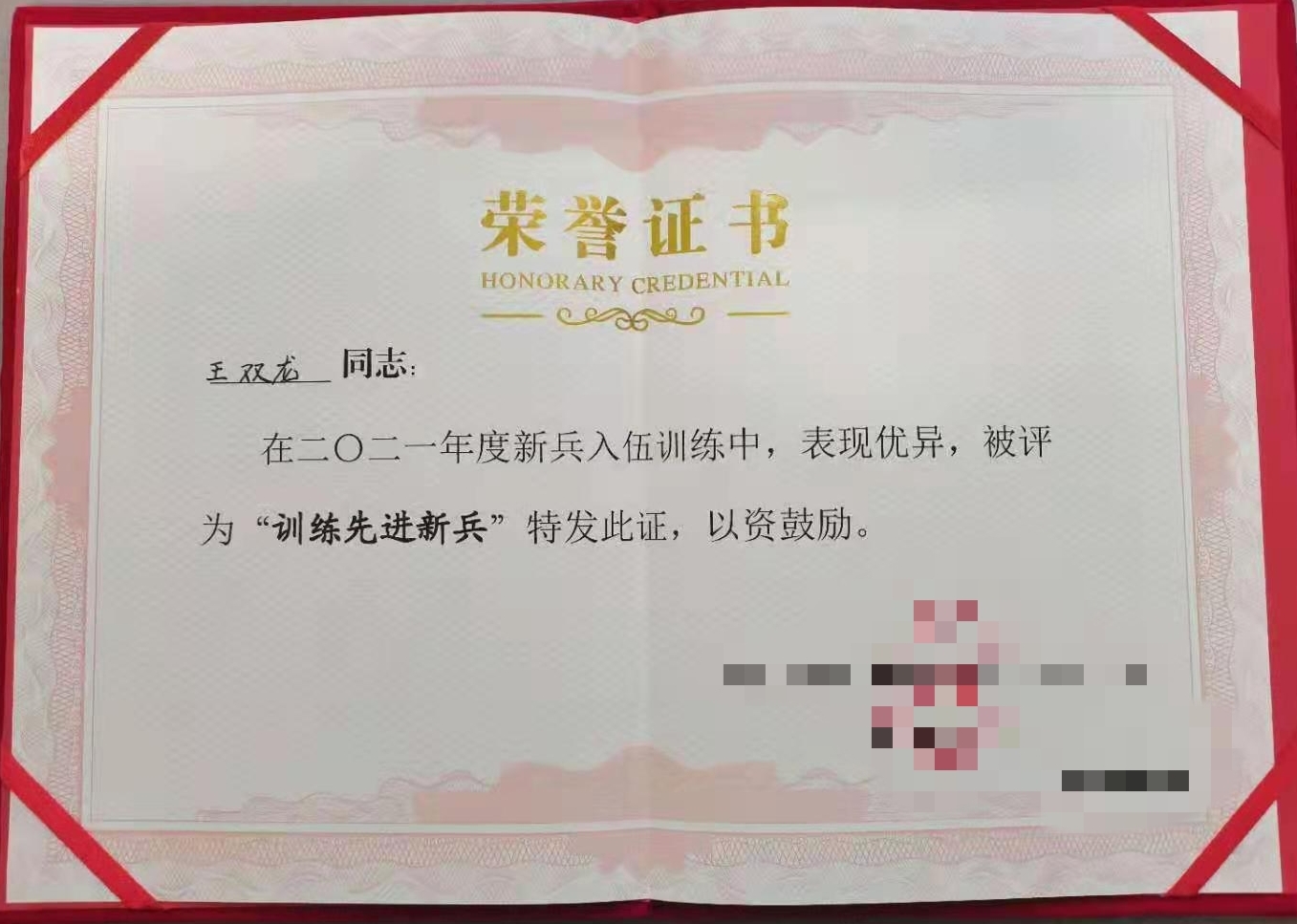 王双龙是pp电子官网2020级思想政治教育专业一班学生,2021年应征入伍,目前服役于陆军某部队。入伍以后,王双龙在训练场上勇往直前,淬炼成钢,各方面表现积极,对于工作和任务认真负责,用实际行动唱响自己的军营梦。通过不断努力,王双龙凭借优异表现荣获2021年度“训练先进新兵”称号,受到陆军某部队领导一致好评。