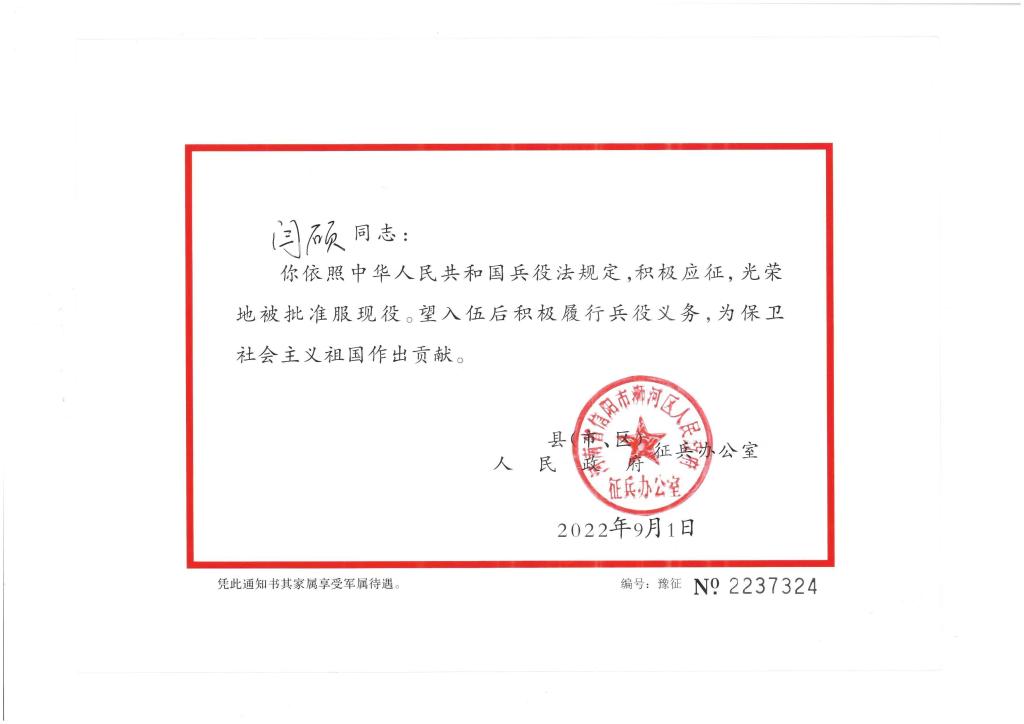 据了解,白杰和闫硕在自身成长过程中便有投身国防、奉献自我的崇高志向,在日常生活中注重提高自身政治觉悟,锤炼意志品质,增强身体素质;在征兵工作中,毅然表明参军意向,主动提交入伍申请材料,并顺利通过层层考核,最终成为一名光荣的义务兵。他们表示,会在军队这个大舞台上施展才华,在军营这个大熔炉中淬炼成钢,将青春与热血挥洒在强军梦、强国梦的伟大实践之中,努力成为一名有灵魂、有本事、有血性、有品德的新时代“四有”军人,为学院增光添彩。据悉,pp电子官方网站始终高度重视大学生征兵工作,不断加大工作统筹力度,详细部署学院征兵计划,切实落实征兵宣传工作,通过征兵主题宣讲会、主题班会与主题团日活动、“一对一”指导等途径开展宣传工作,积极动员广大青年学生应征入伍,大力营造“我参军,我光荣”的校园文化氛围,激发pp电子官网学子崇尚军人的深厚情怀,进一步提升pp电子官网学生报名参军的热情,致力于将更多的高素质人才输送到国防建设中去。