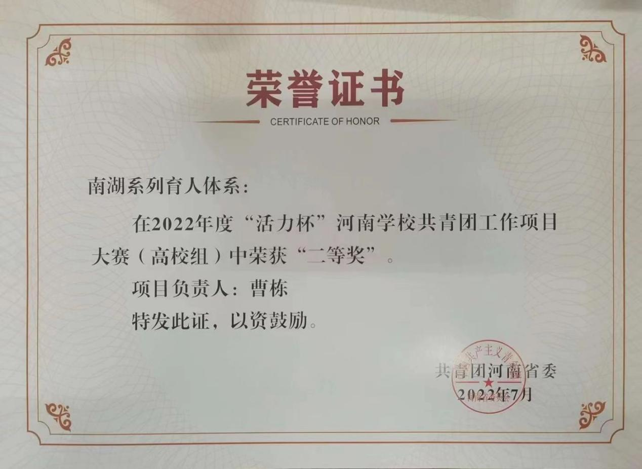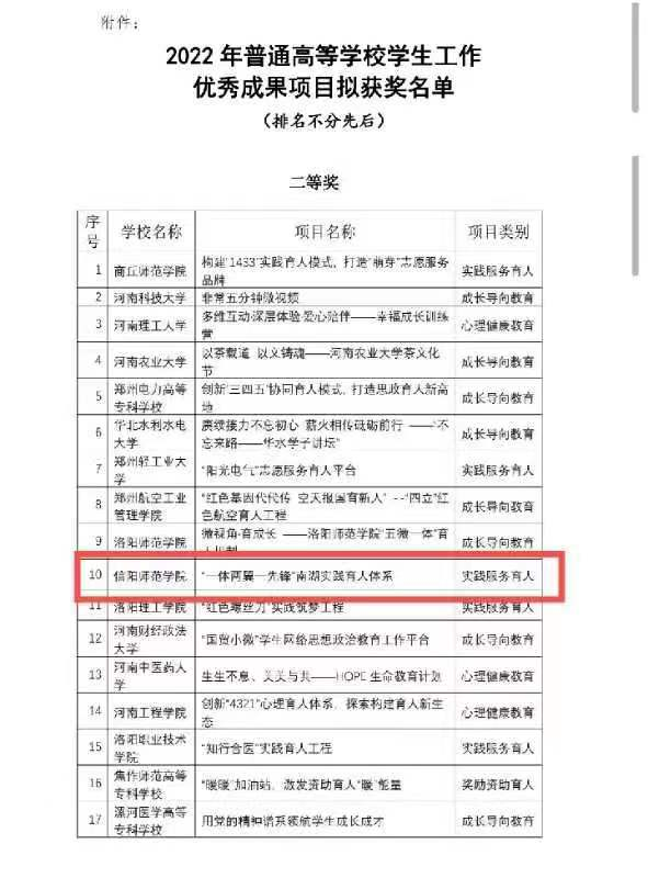 为深入学习贯彻党的二十大精神,河南省教育厅办公室组织开展了2022年普通高等学校学生工作优秀成果项目评选活动。pp电子官方网站“一体两翼一先锋”实践育人体系以脚踏实地的态度、先进的理论指导、丰富多彩的育人活动获得2022年普通高等学校学生工作优秀成果项目拟获奖二等奖。