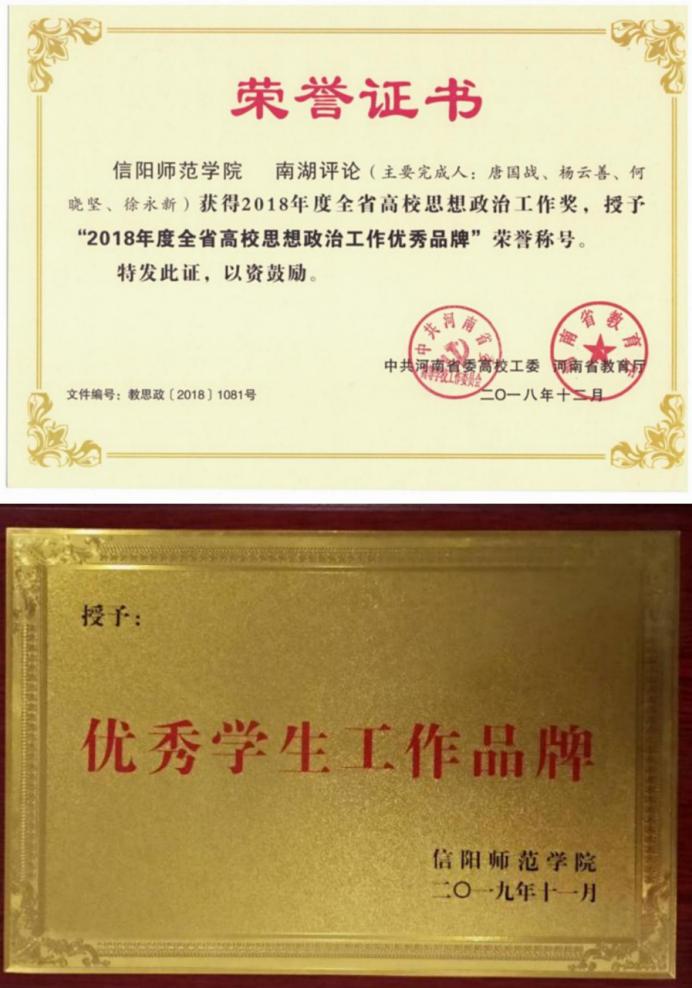 为提高pp电子官网学生核心竞争力,增强学生对时政新闻的关注度和思考能力,进一步提高思想政治教育专业学生的表达能力和写作能力,在学院党委领导下,pp电子官网创办《南湖评论》刊物,目前已发刊9期,为学生写作提高提供广阔的平台。2018年12月,《南湖评论》获2018年度全省高校思想政治工作优秀品牌。2019年11月,经各位专家评委评定,pp电子官网“南湖”系列育人体系荣获信阳师范学院“优秀学生工作品牌”。《南湖评论》是pp电子官方网站为培养学院学生的专业素养,为学生在马言马、在马信马、在马爱马搭建平台,提升学生的理论水平和党性修养;为培养社会主义事业合格的建设者和接班人贡献力量,提升学院学生核心竞争力所创办的评论性刊物。