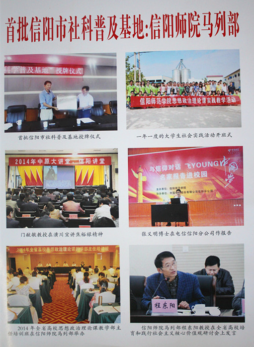 目前,信阳师范学院马列部领导班子和全体教师,正以党的十八大、十八届三中、四中全会精神为指导,团结奋进,再接再励,为巩固我校在河南省高校思想政治理论课教学战线中第一方阵的地位,充分发挥首批信阳市社科普及基地的重要作用,为更好地服务信阳乃至河南省经济社会发展而不懈努力。
