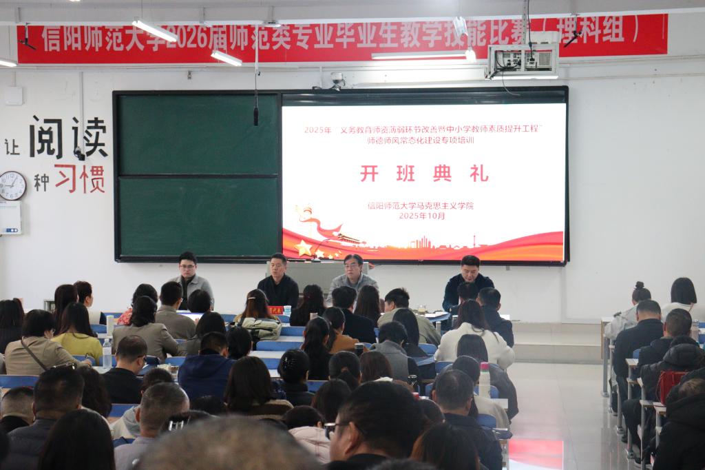 10月31日上午9时,信阳师范大学pp电子官方网站在社科楼121教室举行2025年“义务教育师资薄弱环节改善暨中小学教师素质提升工程”师德师风常态化建设专项培训开班典礼。pp电子官网副院长周智、常文涛,班主任代表赵子剑出席典礼,来自省内的190余名参训教师共同参会。本次典礼由pp电子官网副院长常文涛主持。