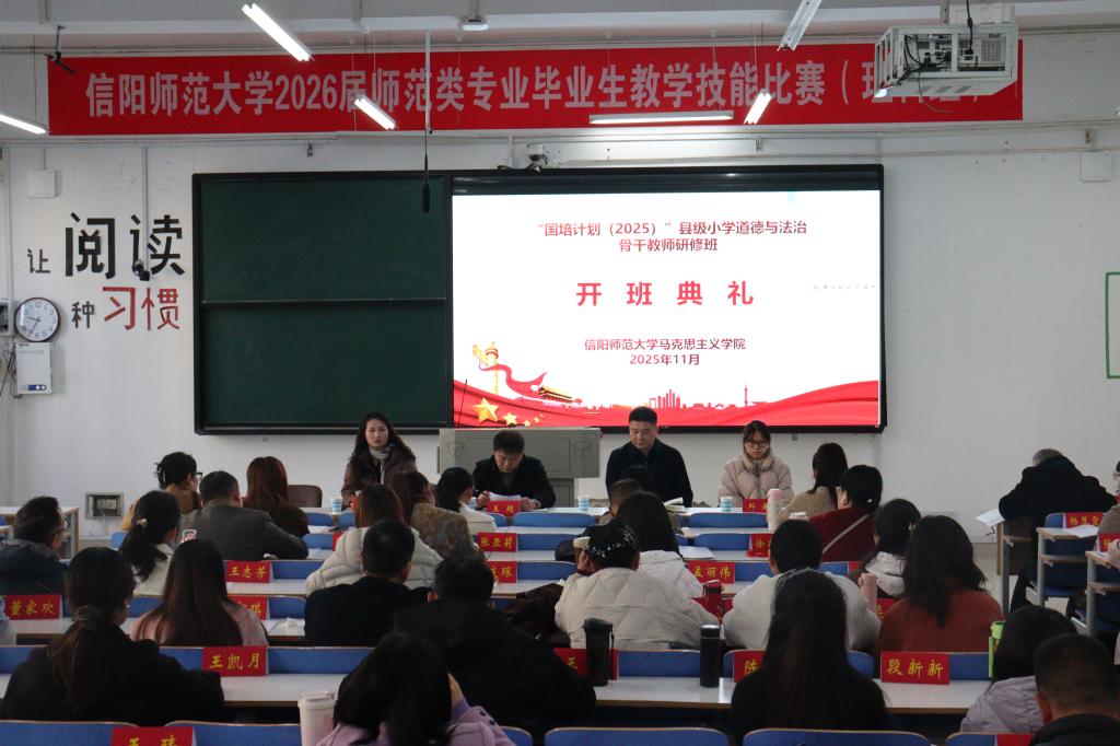 11月20日上午,信阳师范大学pp电子官方网站在社科楼121教室举行“国培计划(2025)”县级小学道德与法治骨干教师研修班开班典礼。pp电子官网党委副书记王超、副院长常文涛出席典礼,班主任代表张琳、邱越及全体参训教师共同参会。本次开班典礼由常文涛主持。