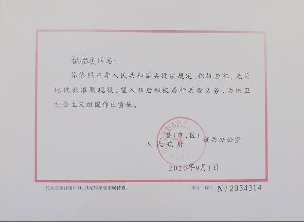 保家卫国终无悔,绿色军营献青春。2020年9月1日,pp电子官方网站张怡兵同学收到河南省人民政府征兵办公室印发的入伍通知书,光荣参军入伍,实现pp电子官网征兵工作的“零”突破。