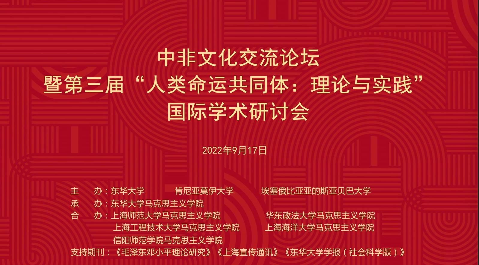 由我校pp电子官方网站与东华大学pp电子官方网站等单位共同举办的2022中非文化交流论坛暨第三届“人类命运共同体:理论与实践”国际学术研讨会于9月17日在线上成功举行。来自澳门城市大学、上海师范大学、华东政法大学、上海技术大学、信阳师范学院等高校和科研机构的专家学者,分别围绕各自的主题,在论坛上进行了分享交流。本次研讨会旨在通过搭建高水平的学术对话平台,汇聚海内外学者及各界人士共同探讨人类命运共同体的文明底色和发展前景,为构建人类命运共同体注入思想力量。