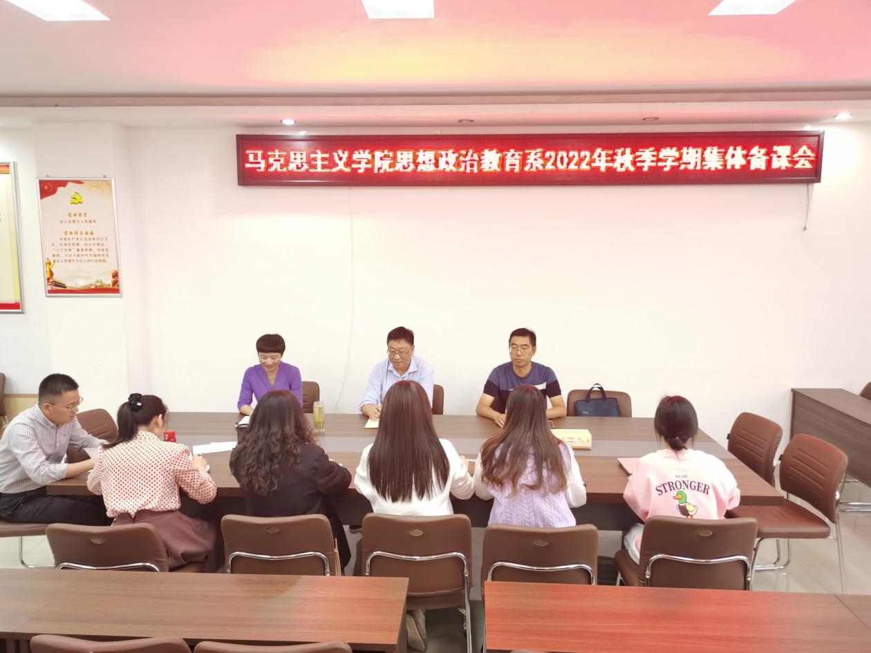 9月23日下午,思想政治教育系在社科楼323会议室召开集体备课会,pp电子官方网站副院长程晋富、李蕊及思政系全体教师参加了会议,会议由思政系主任王建礼主持。