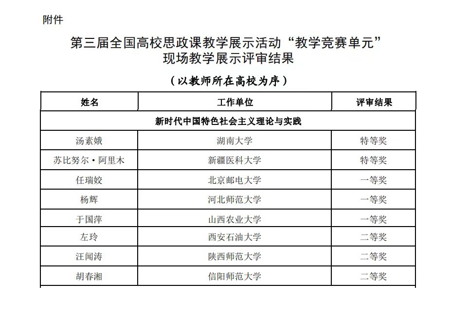 近日,第三届全国高校思想政治理论课教学展示活动“教学竞赛单元”现场教学展示评审结果揭晓。pp电子官网教师胡春湘荣获“新时代中国特色社会主义理论与实践”组二等奖。