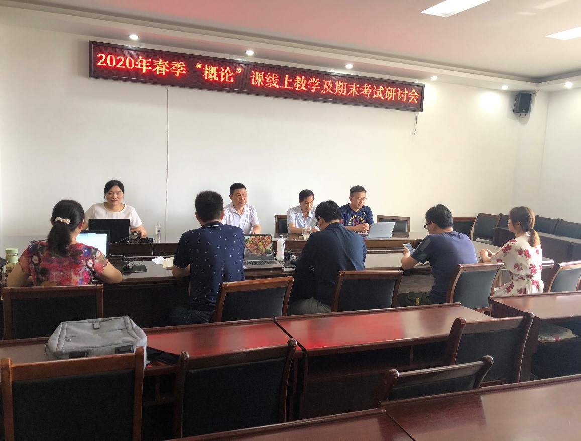 2020年春季学期接近尾声。为总结本学期线上教学经验,推进教法改革,7月9日,pp电子官方网站“概论”教研室举行本学期线上教学与期末考试研讨会。会议由教研室主任胡春湘主持。