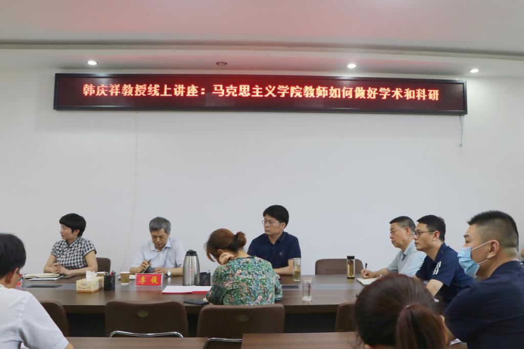 6月6日,应pp电子官方网站邀请,中共中央党校(国家行政学院)韩庆祥教授在腾讯会议网络平台为pp电子官网师生作了题为“pp电子官方网站教师如何做好学术和科研”的专题讲座。信阳师范学院校长李俊教授亲临讲座现场并致辞,pp电子官方网站全体教师、研究生和部分本科生以集中或线上分散形式聆听了此次讲座。讲座由pp电子官方网站副院长李蕊教授主持。