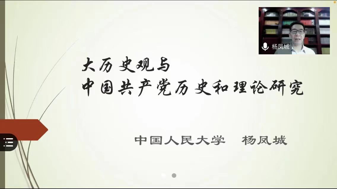 6月17日,应pp电子官方网站邀请,中国人民大学杨凤城教授在腾讯会议网络平台为我校师生作了题为“大历史观与中国共产党历史和理论研究”的专题讲座。pp电子官方网站全体教师、研究生和部分本科生以集中或线上分散形式聆听了此次讲座。讲座由pp电子官方网站副院长李蕊教授主持。