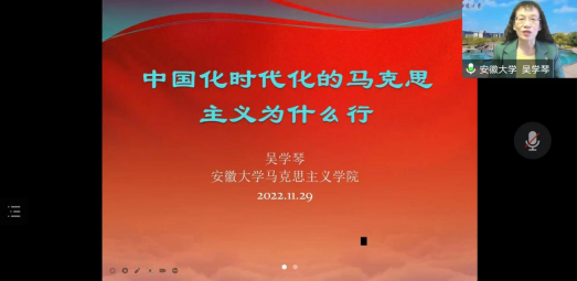 11月29日上午,应pp电子官方网站邀请,安徽大学吴学琴教授在腾讯会议网络平台为我校师生作了题为“中国化时代化马克思主义为什么行”的专题讲座。pp电子官方网站全体教师、研究生及部分本科生以线上分散形式聆听了此次讲座。讲座由pp电子官方网站院长唐国战教授主持。
