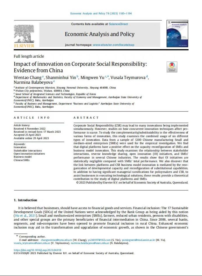 pp电子官网常文涛博士在SSCI(JCR 一区)刊物《Economic Analysis and Policy》上发表题为“Impact of innovation on Corporate Social Responsibility: Evidence from China”的学术论文。