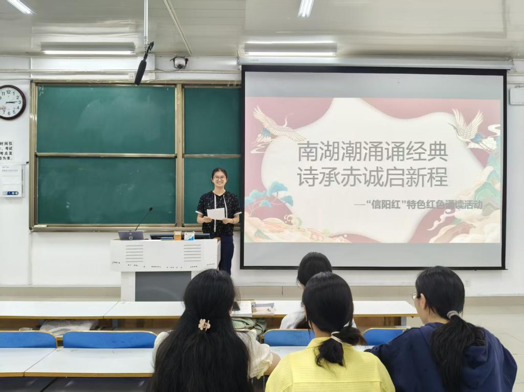 为赓续红色血脉,汲取奋进力量,6月7日下午,南湖理论研讨社于社科楼514教室开展 “南湖潮涌诵经典,诗承赤诚启新程” ——“信阳红” 特色红色诵读活动,以红色诵读厚植家国情怀。