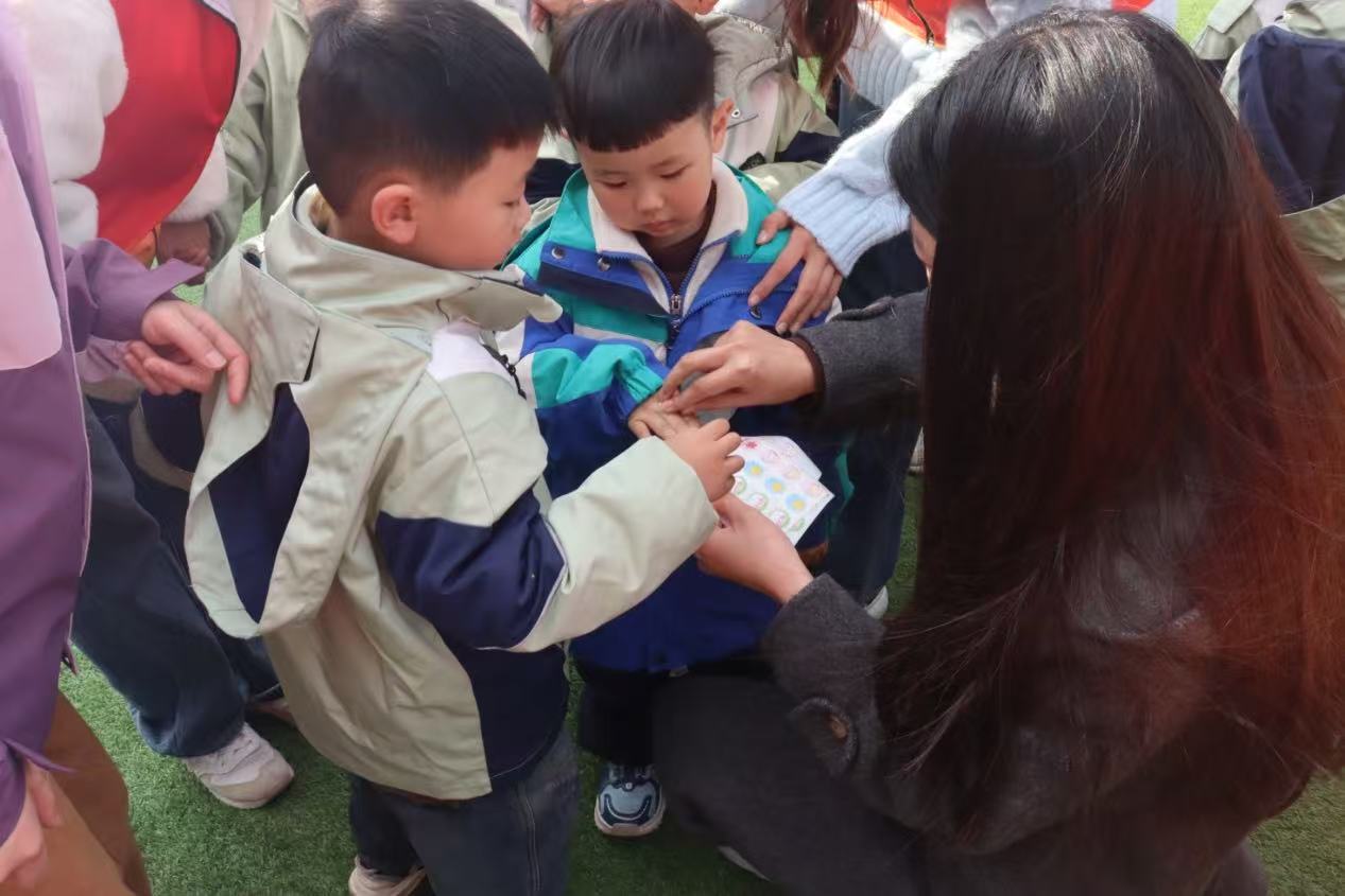 活动采取“1+2”结对模式,每位青马学员带领两名幼儿开展游戏。在志愿者引导下,孩子们先后体验了两人三足、丢手绢、一二三木头人等经典游戏。丢手绢环节中,围坐成圈的孩子们在追逐嬉戏间绽放纯真笑靥;木头人游戏中,定格的滑稽姿势引发阵阵欢笑。每轮游戏结束后,青马学员为表现优异的小朋友颁发“文明小先锋”贴纸奖励。活动尾声,志愿者们为全体幼儿发放纪念贴画并合影留念。临别时,孩子们依依不舍地与青马学员挥手道别。活动结束后,学员们有序完成场地清扫与教具归整工作。