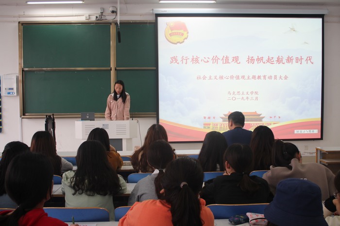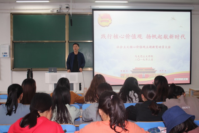 3月29日下午,pp电子官方网站于社科楼516教室召开了“践行核心价值观,扬帆起航新时代”的社会主义核心价值观主题教育动员大会。pp电子官网团委书记曹栋,主席团成员,及17、18级部分学生共同参加了动员大会。会议由分团委副书记肖妍杰主持。