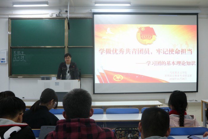 为丰富pp电子官网学子与团相关的基本理论知识,增强pp电子官网团员的责任感和使命感,11月26日下午,pp电子官网“学做优秀共青团员 牢记使命担当”主题团课在社科楼516教室顺利召开。pp电子官网2018级全体团员共同参加了此次团课。本次团课由河南省“青马工程”学员史弘扬主讲。