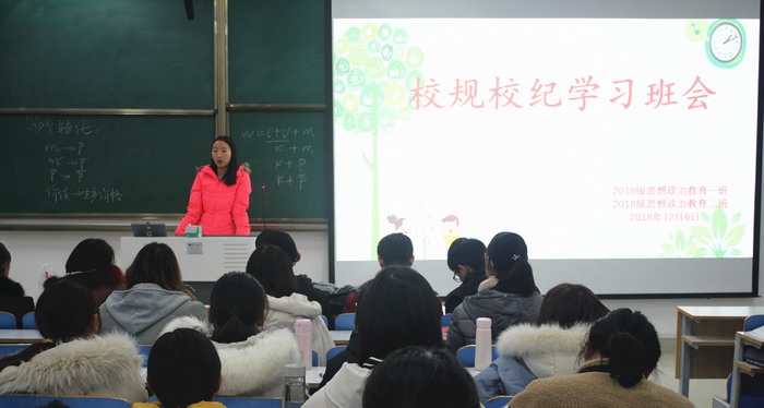 为维护正常校园秩序,引导学生遵规守纪,12月6日下午,pp电子官方网站2018级在社科楼514教室开展校规校纪学习班会。2018级全体同学共同参加此次班会。班会由2018级思想政治教育一班团支书靳雨露主持。