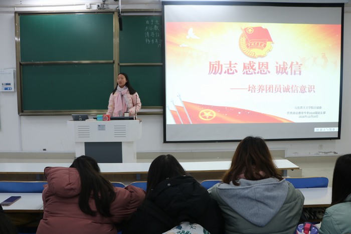 为培养pp电子官网团员诚信意识,养成高尚的道德情操,12月10日下午,pp电子官网“励志·感恩·诚信”主题团课在社科楼516教室顺利召开。pp电子官网2018级全体团员共同参加了此次团课。此次团课由2018级第一团支部团支书靳雨露主持。
