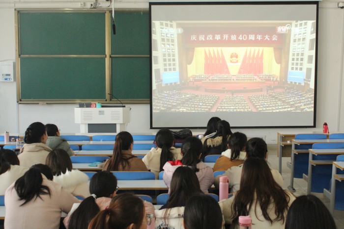 大会上,习近平作出重要讲话,充分肯定了以邓小平同志为主要代表的中国共产党人作出的改革开放重大决策,深刻阐释了毛泽东思想、邓小平理论、三个代表、科学发展观和新时代中国特色社会主义思想对于推动中国特色社会主义发展的重大意义,总结了改革开放以来中国共产党取得的伟大成就,提出了新时代深化改革开放的新要求。他指出,要团结带领各族人民坚持解放思想和实事求是有机统一,高举中国特色社会主义伟大旗帜,不忘初心,牢记使命,将改革开放进行到底。此次直播视频的观看使同学们直观地感受到改革开放所带来的巨大转变,激发了爱国热情,引起阵阵掌声。播放结束后,同学们互相交流心得与体会,他们认为,作为新时代的青年应当强化责任担当意识,为社会主义现代化强国建设贡献自己的力量。