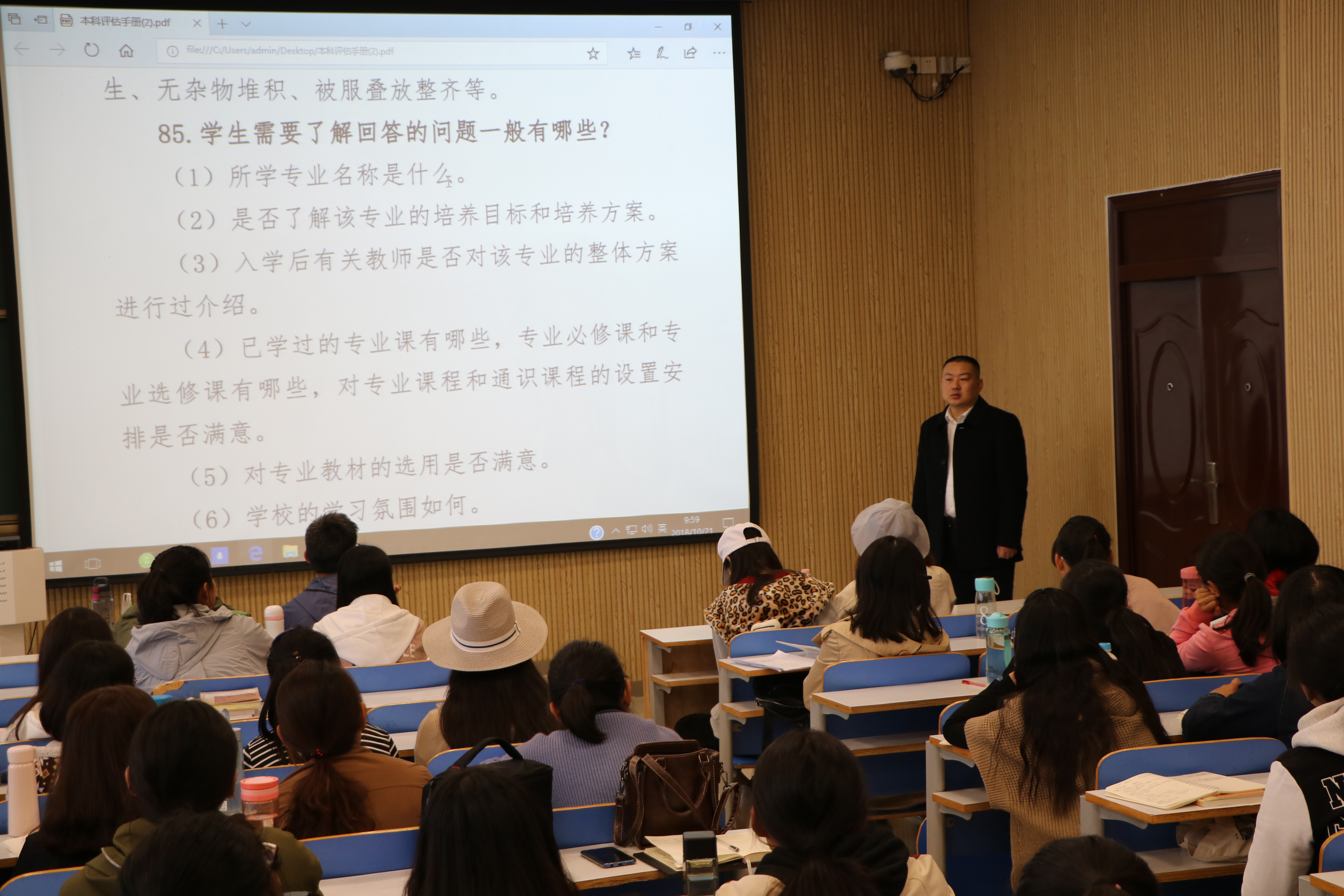 为迎接我校本科教学工作的审核评估,提高pp电子官网学生关心评估、了解评估、参与评估、支持评估的意识,10月21日上午,pp电子官网在社科楼416、514、515、517教室组织召开审核评估知识学习会。pp电子官网全体学生共同参与本次学习会。学习会由各班级负责人带领学习。