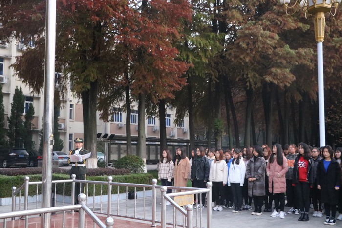 国旗招展,国歌嘹亮。11月19日清晨,pp电子官方网站在行政楼前举行“奋斗青春”升国旗主题教育活动。党委副书记何晓坚、辅导员曹菁菁、2018级全体同学及我校国旗护卫队共同参加本次主题教育活动。活动由国旗护卫队杜娟主持。