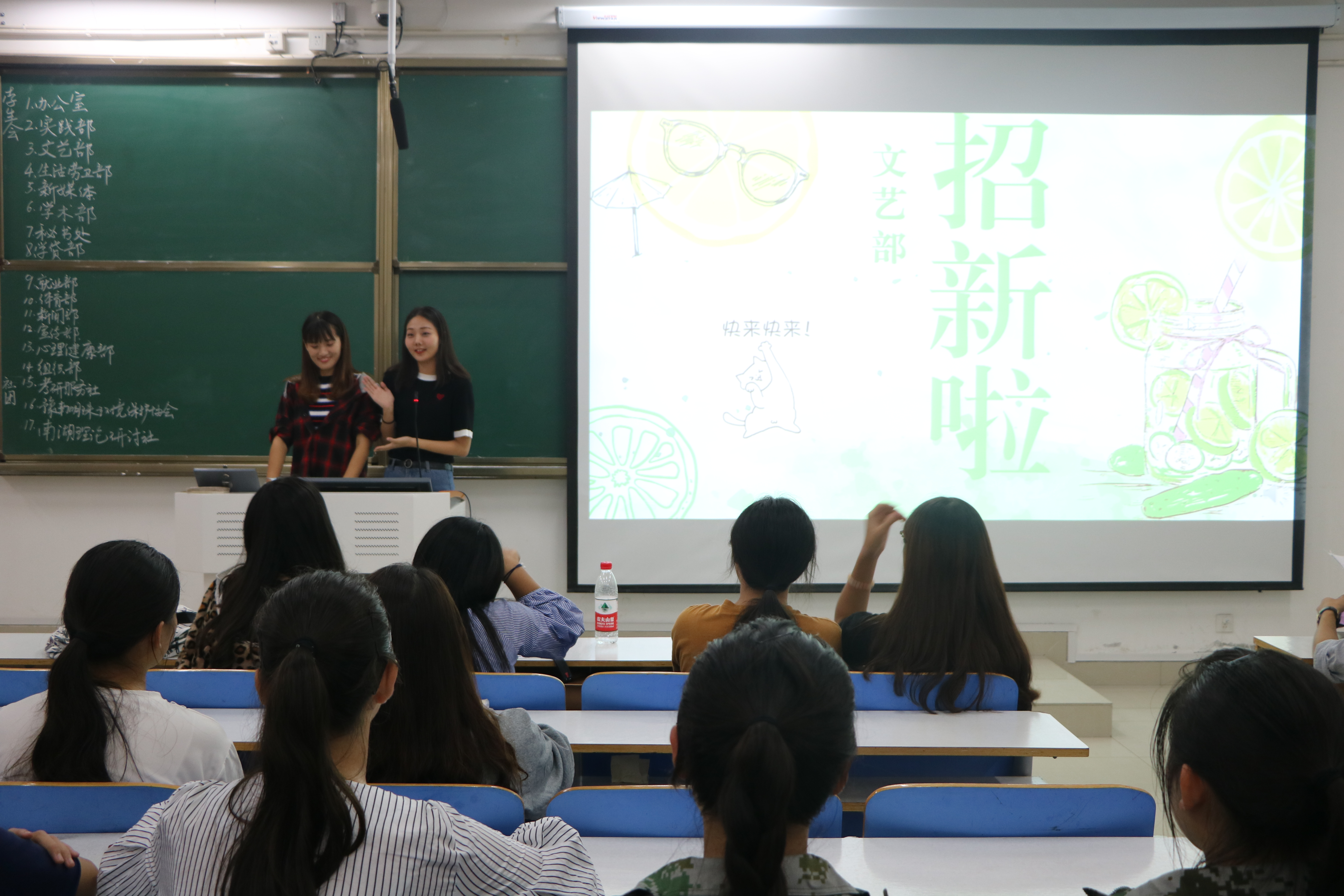 首先,韩晨曦指出在大学阶段学习固然是最重要的,但综合能力的培养也是十分必要的,学生会、社团为大家提供了一个提升能力和施展才华的平台,希望同学们在详细了解各个部门的职能与特色后,依照自己的兴趣爱好做出选择。接着各部门和社团主讲人通过PPT的形式从部门职能、部门性质、日常工作、特色活动、所获成就等方面向参会人员进行了讲解,并详细说明了本次招新的人员要求,希望大家踊跃报名。宣讲过程中,台下掌声不断,现场气氛十分融洽。