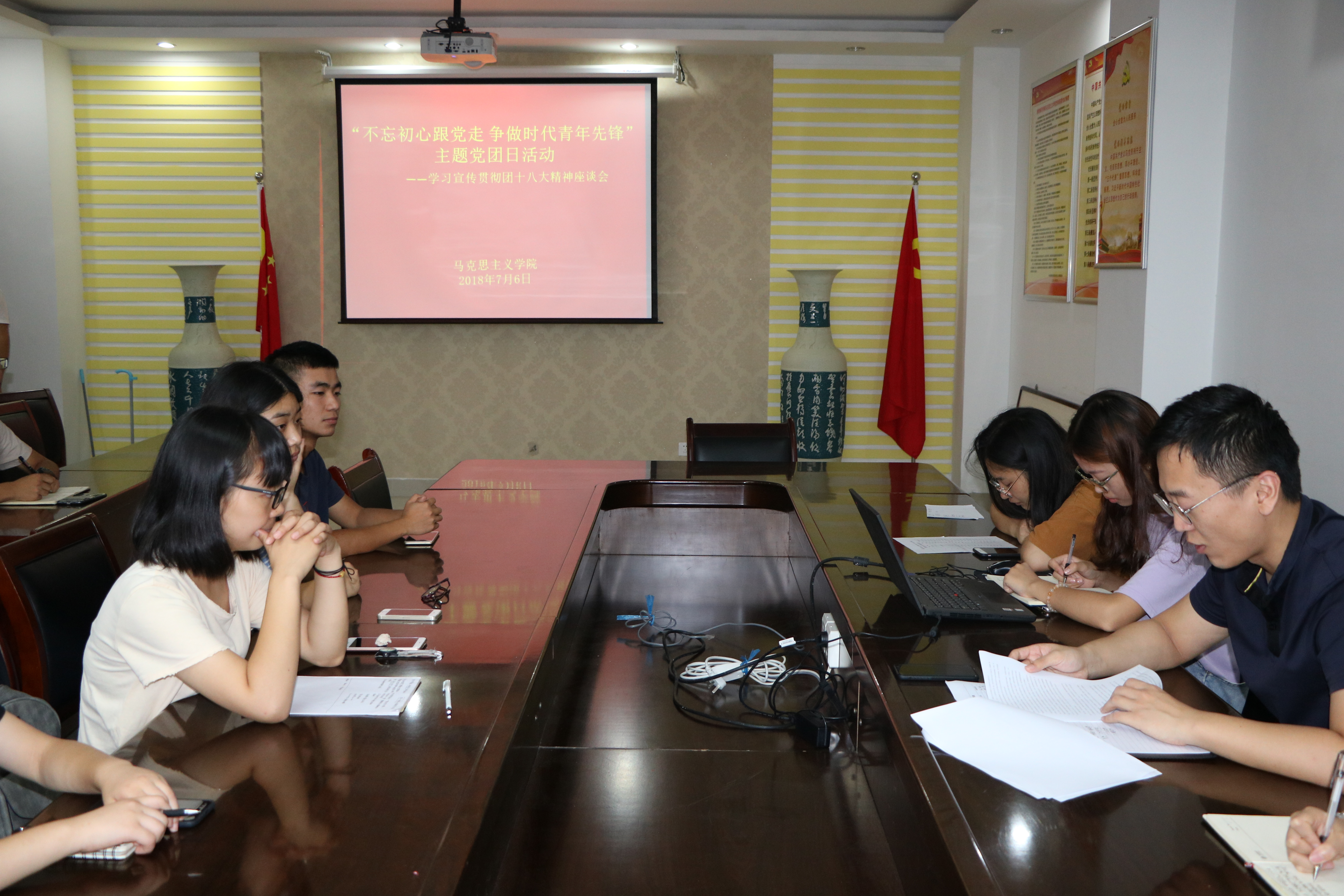 为加强对广大青年团员的教育,学习贯彻习近平新时代中国特色社会主义思想和党的十九大精神,7月6日下午,pp电子官方网站于323会议室开展了“不忘初心跟党走,争做时代青年先锋”主题党团日活动,组织团员青年学习座谈中国共产主义青年团第十八次全国代表大会精神。pp电子官网团委书记曹栋与20名团员代表共同参加了此次会议。会议由曹栋主持。