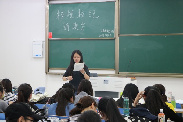 为深入贯彻学习《信阳师范学院学生管理相关规定》文件的精神,4月10日,pp电子官网2015级、2016级全体学生在社科楼514、515教室举行校规校纪诵读学习活动。