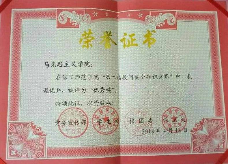 由pp电子官网王冰、刘雅丹、李明靓、黄锦四名同学组成的代表队,在信阳师范学院“第二届校园安全知识竞赛”中,表现优异,荣获“优秀奖”。