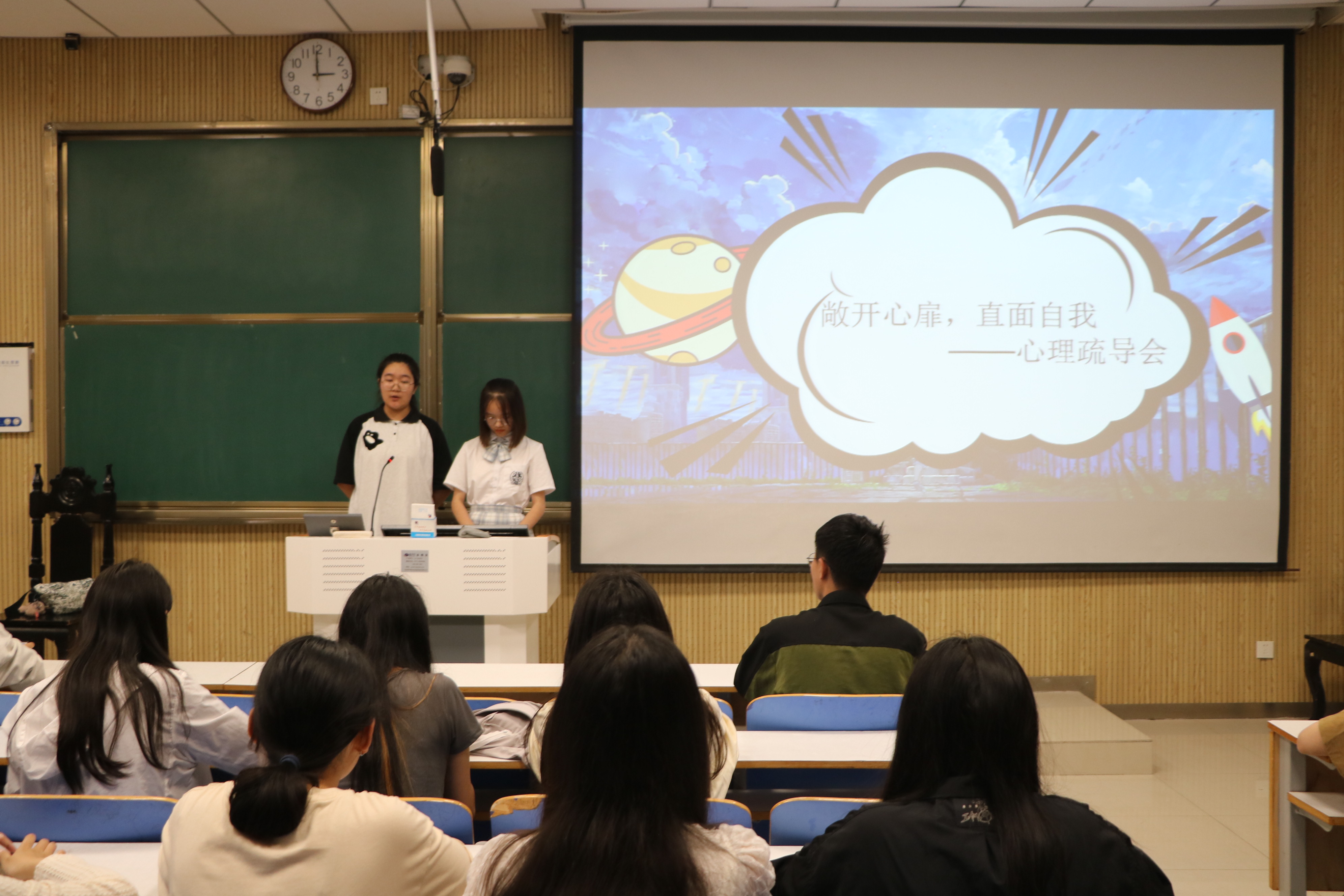 本次疏导会由“常见心理问题”、“性格测试”、“敞开心扉纸条”、“如何面对心理问题”四个部分组成。首先,李冉列举了如何化解学习压力、如何与他人友好相处等大学生活中常见的烦恼。随后,她通过“性格测试”和“敞开心扉纸条”两个活动与同学们进行现场互动。“性格测试”活动列举了三道选择题帮助同学们加深自我认知,明确自身优缺点。“敞开心扉纸条”活动则通过匿名问答的方式动员大家相互交流,互诉心声。最后,李佳欣将理论知识与自身经历相结合,为大家排忧解难。她指出,当我们面对心理问题时,一要及时与亲友倾诉烦恼;二要适当地转移注意力,理智对待情感问题;三要及时确立奋斗目标,树立人生方向。通过这些方法能够有效调解个人情绪,化解心理危机。