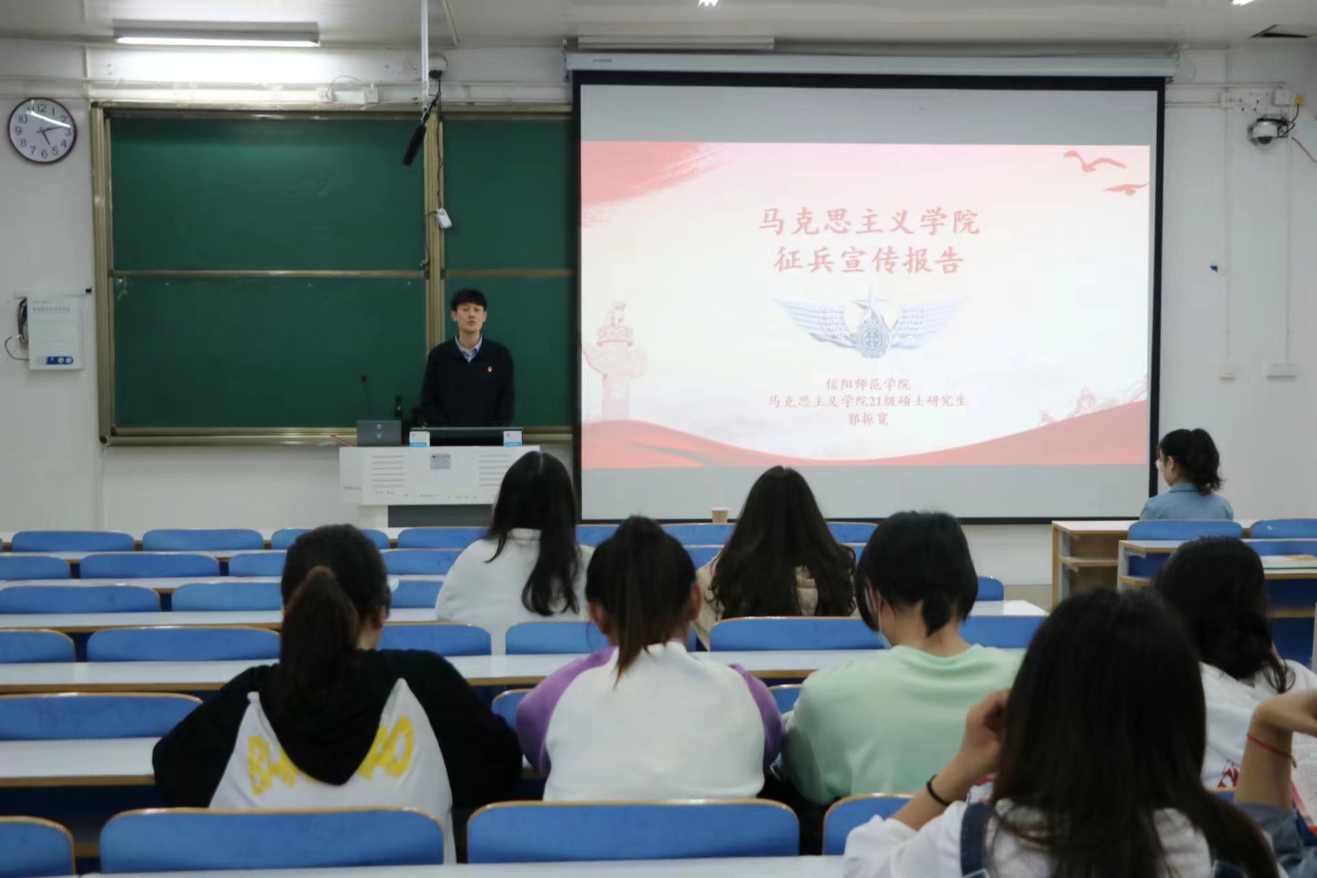 志存高远砺青春,建功立业赴军营。为进一步做好国家征兵政策宣传,将征兵工作融入立德树人教育环节,5月26日下午,pp电子官方网站在社科楼514教室召开征兵入伍宣讲会,团委老师高小佳、专职辅导员沈海蓄、优秀退伍大学生代表郭振宽和2019级毕业生共同参与此次宣讲会。会议由团委老师高小佳主持。