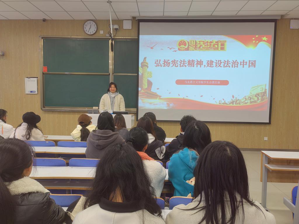 为增强宪法意识、弘扬宪法精神,增强法治认同感,形成正确的法治观念和行为习惯,12月5日上午,pp电子官方网站团委学生会团支部在社科楼515教室开展“弘扬宪法精神,建设法治中国”主题团课。pp电子官网学生会团支部全体成员共同参与本次团课。团课由团支部委员张芝一主持。