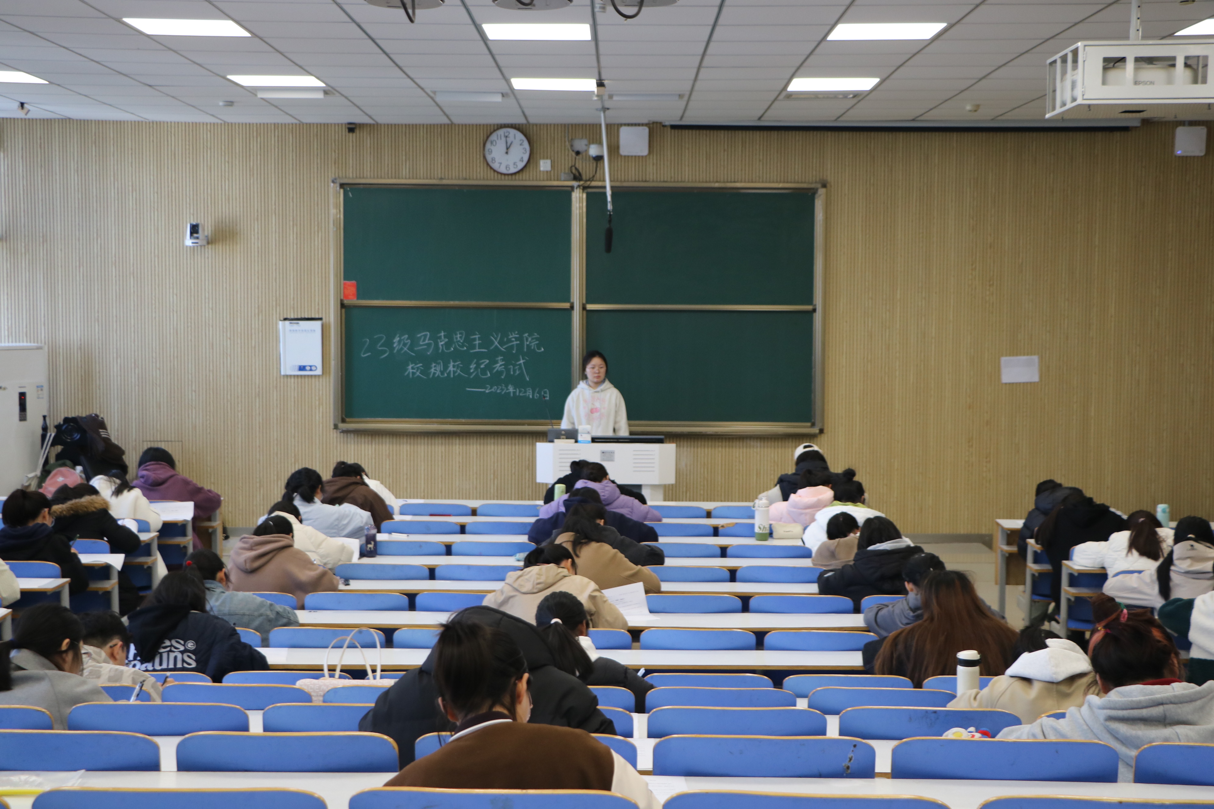 为深化学生规则意识、加强校风学风建设,推动学生管理工作的顺利开展,12月6日中午,pp电子官方网站在社科楼514、515教室组织2023级新生进行校规校纪考试。pp电子官网2023级全体新生共同参与考试。生活劳卫部郑慧芳、陈颖担任监考员。