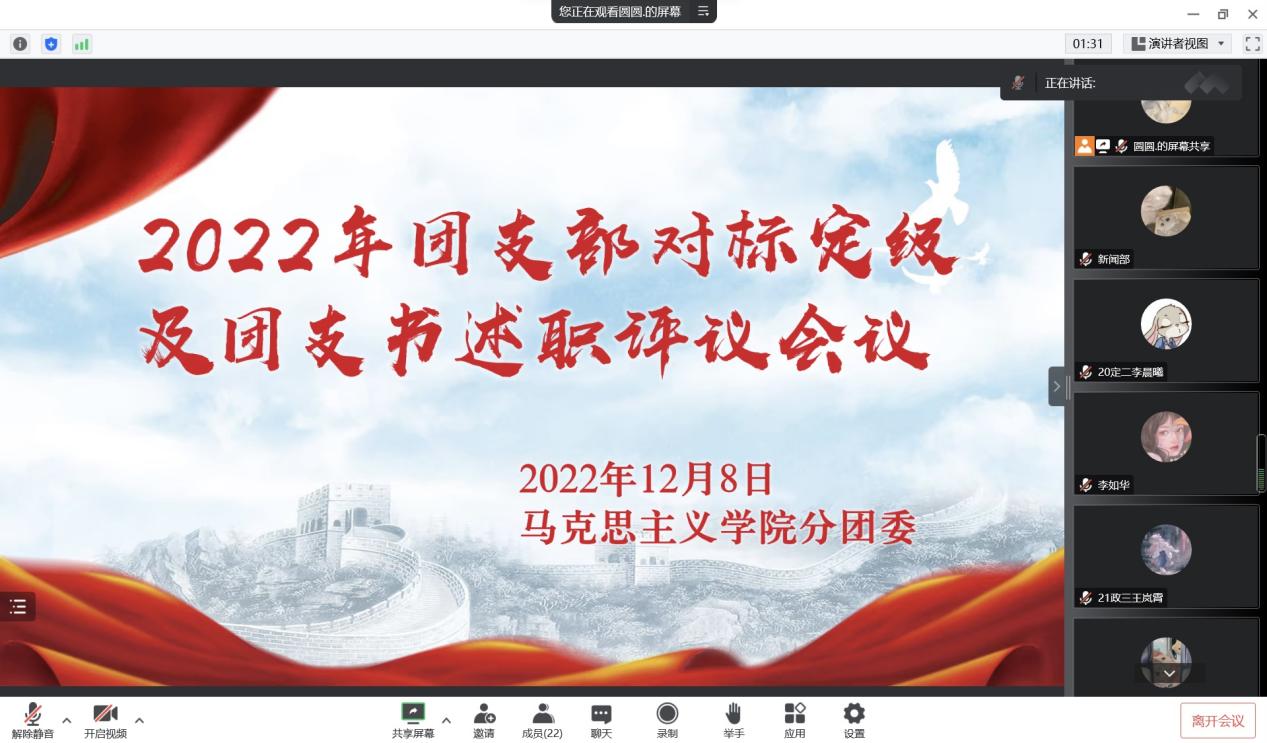 为增进各团支部之间的学习交流,加强pp电子官方网站团支部建设,12月8日下午,pp电子官方网站在线上召开2022年团支部对标定级及团支书述职评议会议。班主任代表杨春艳及各班团支书共同参与本次会议。会议由分团委副书记张晴主持。