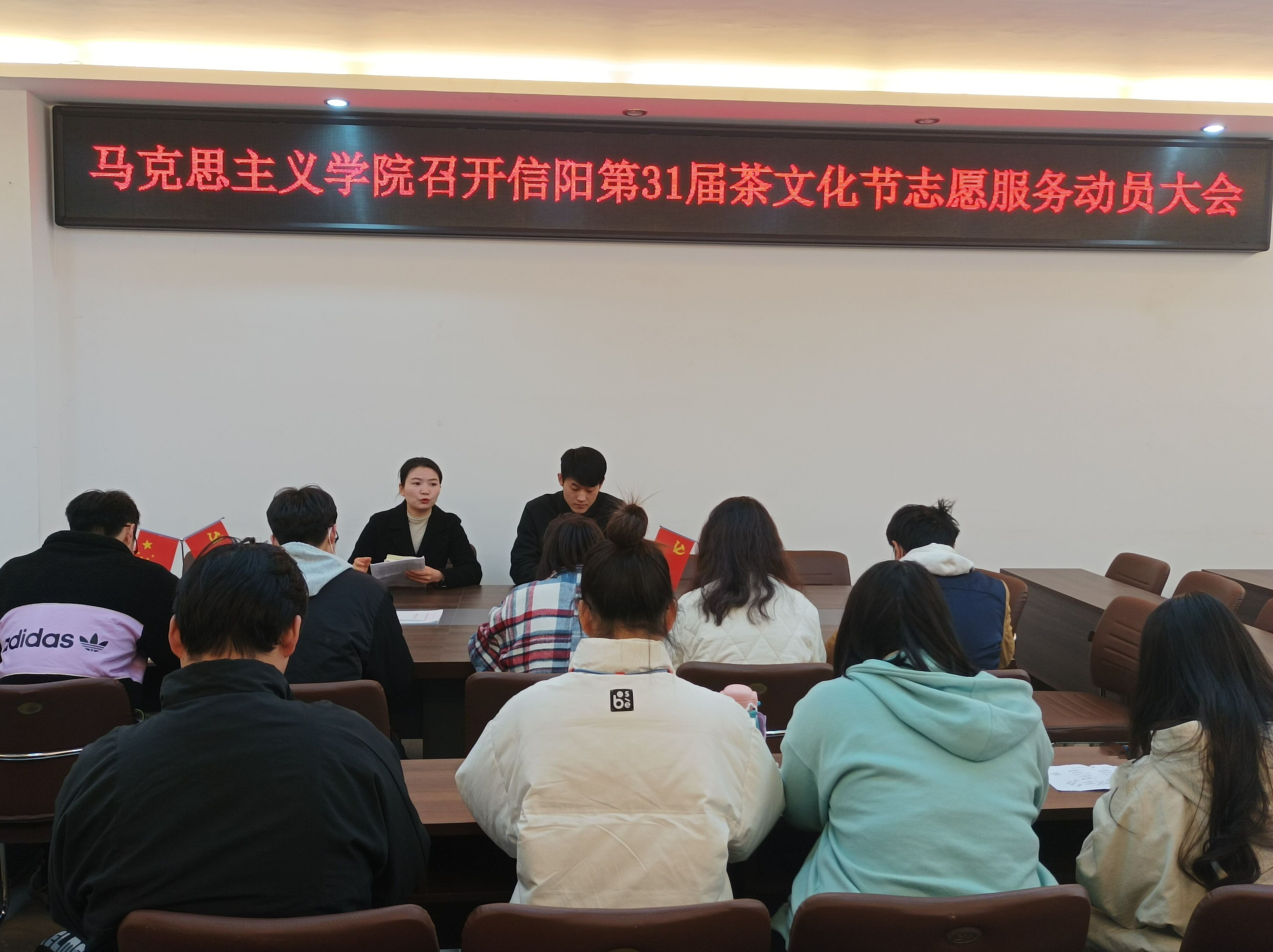 为弘扬青年“奉献、友爱、互助、进步”的志愿服务精神,3月16日上午,pp电子官方网站在社科楼323会议室召开信阳第31届茶文化节志愿服务动员大会。pp电子官网团委书记陶青青、辅导员沈海蓄、主席团成员及各班团支书共同参与本次会议。会议由陶青青主持。