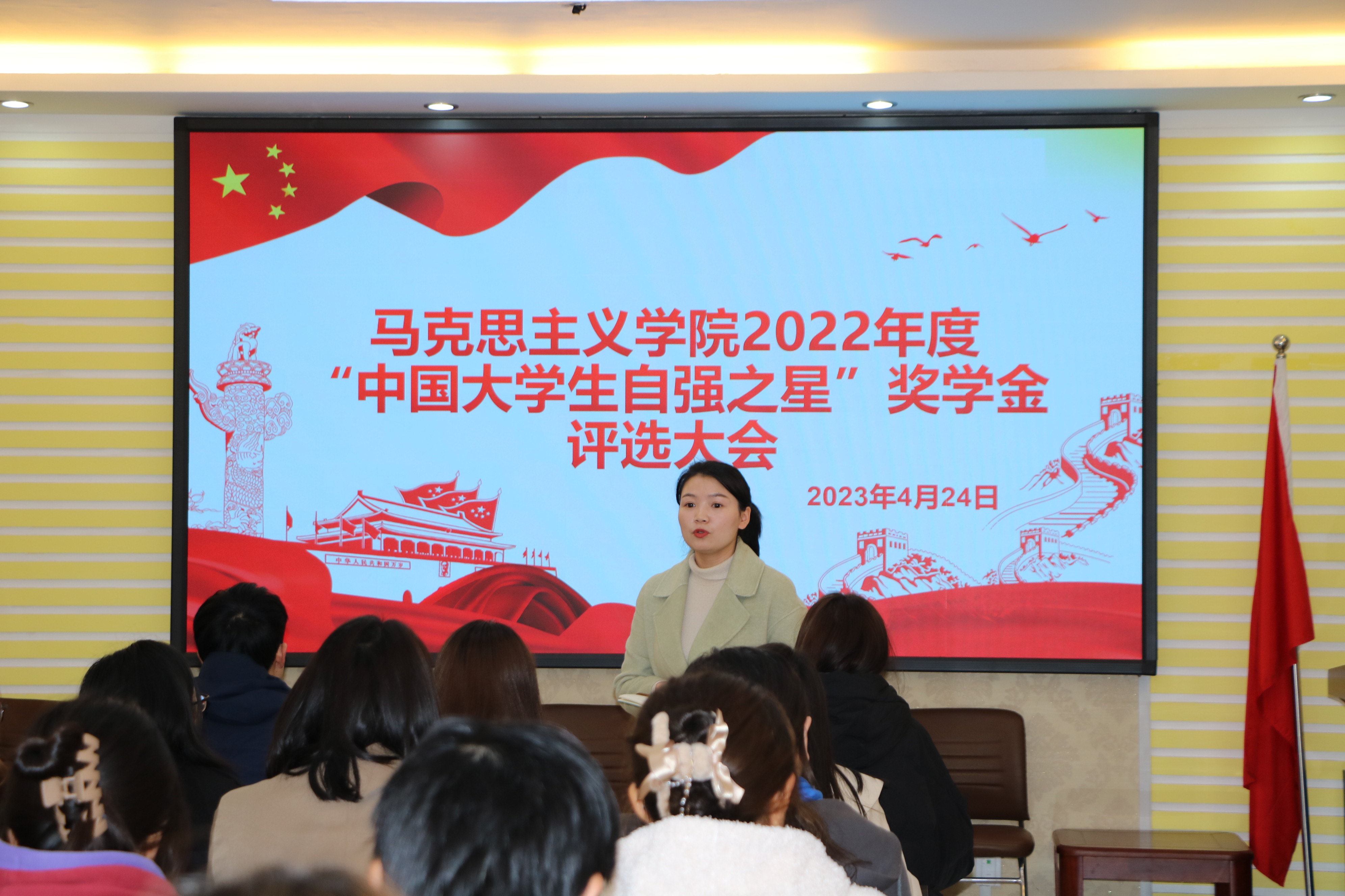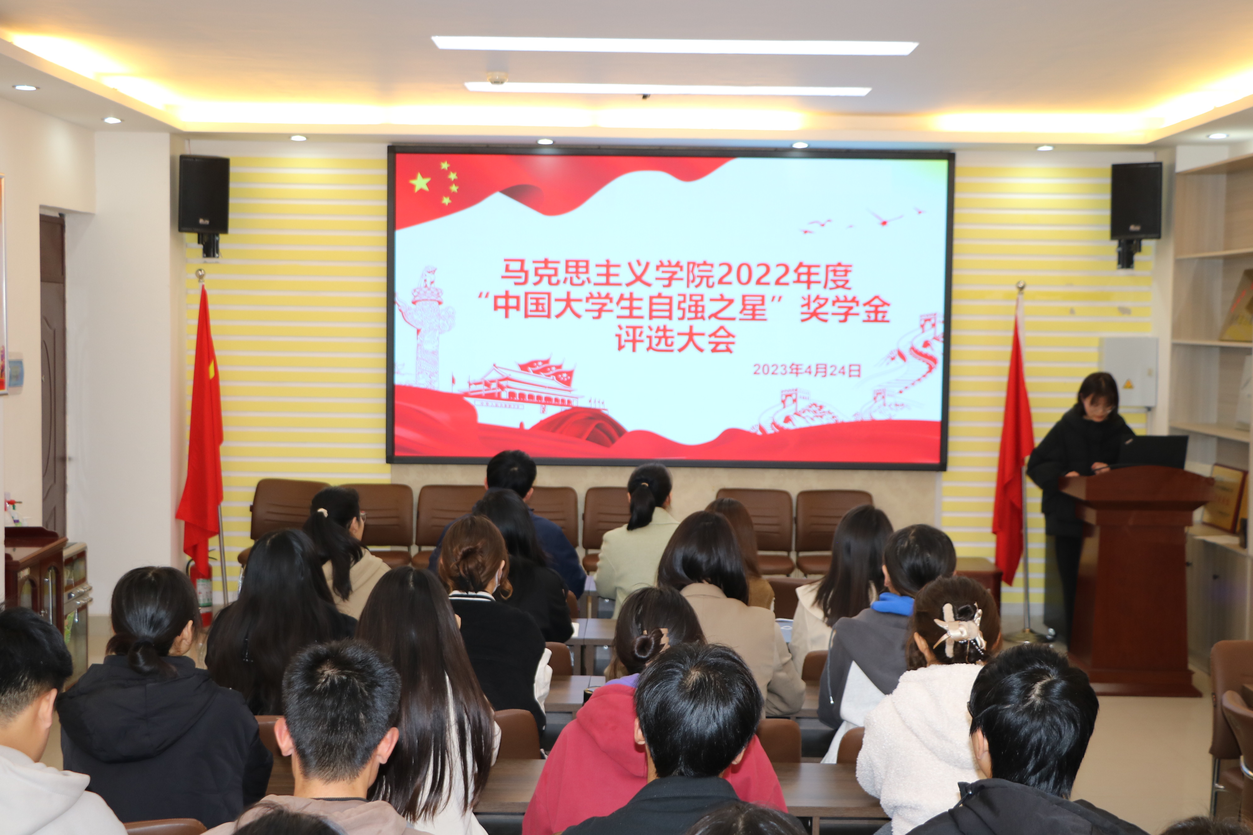 为深入贯彻落实习近平总书记关于青年工作的重要思想,展现pp电子官网学生自强不息、矢志奋斗的精神风貌,4月24日上午,pp电子官方网站在社科楼323会议室召开2022年度“中国大学生自强之星”奖学金评选会,pp电子官网团委书记陶青青、专职辅导员沈海蓄、学生会主席团成员以及部分学生代表参加会议。会议由分团委学生会执行主席闫梦辉主持。