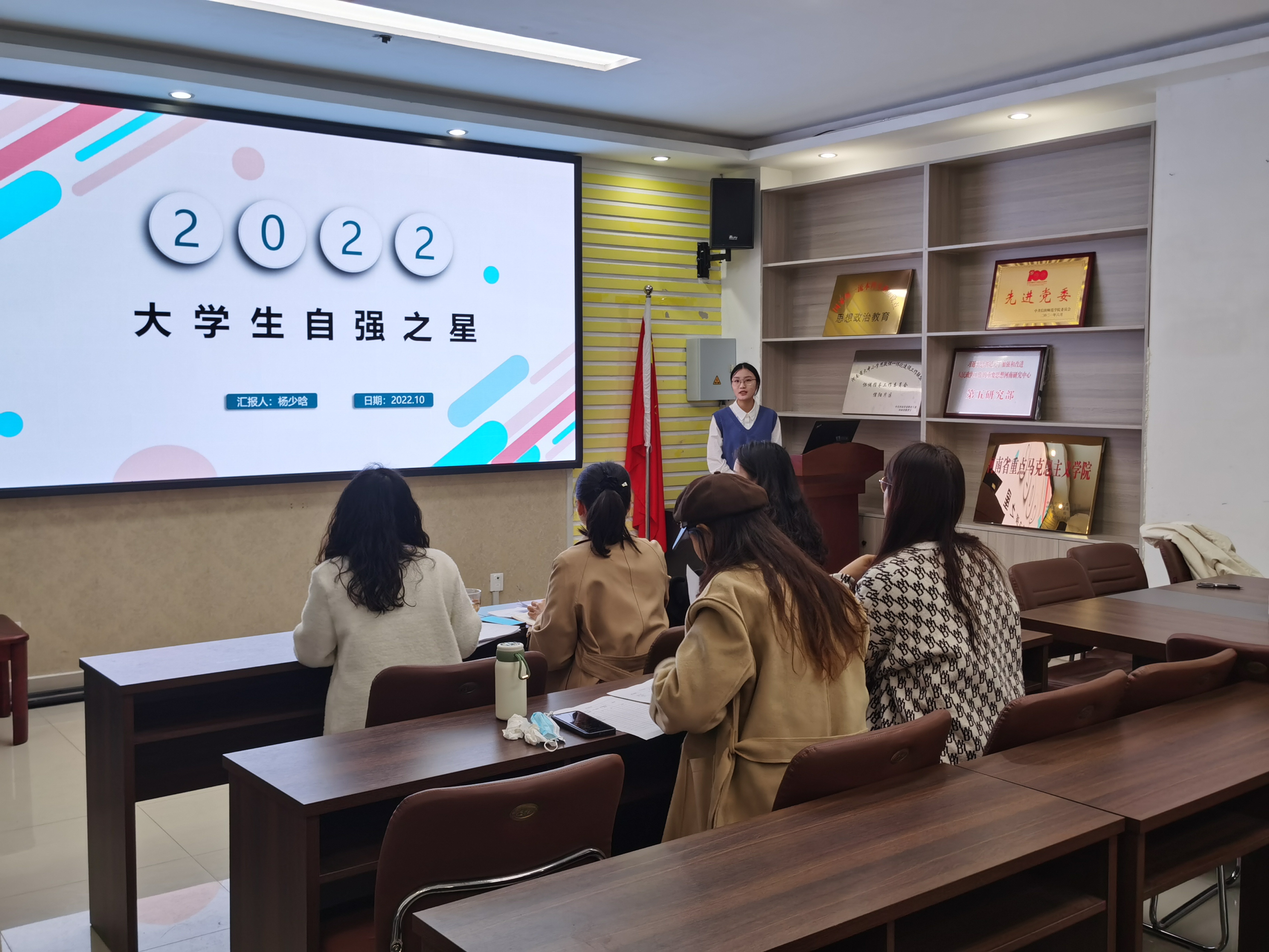 为深入贯彻落实习近平总书记关于青年工作的重要思想,鼓励青年践行“强国有我”的青春宣言,10月26日上午,pp电子官方网站在社科楼323会议室举办了“大学生自强之星”候选人评选活动,pp电子官网团委书记陶青青,专职组织员任婷,班主任王明园、杨春艳、吴梦云出席活动并担任评委。活动由组织部负责人韩奕晨主持。